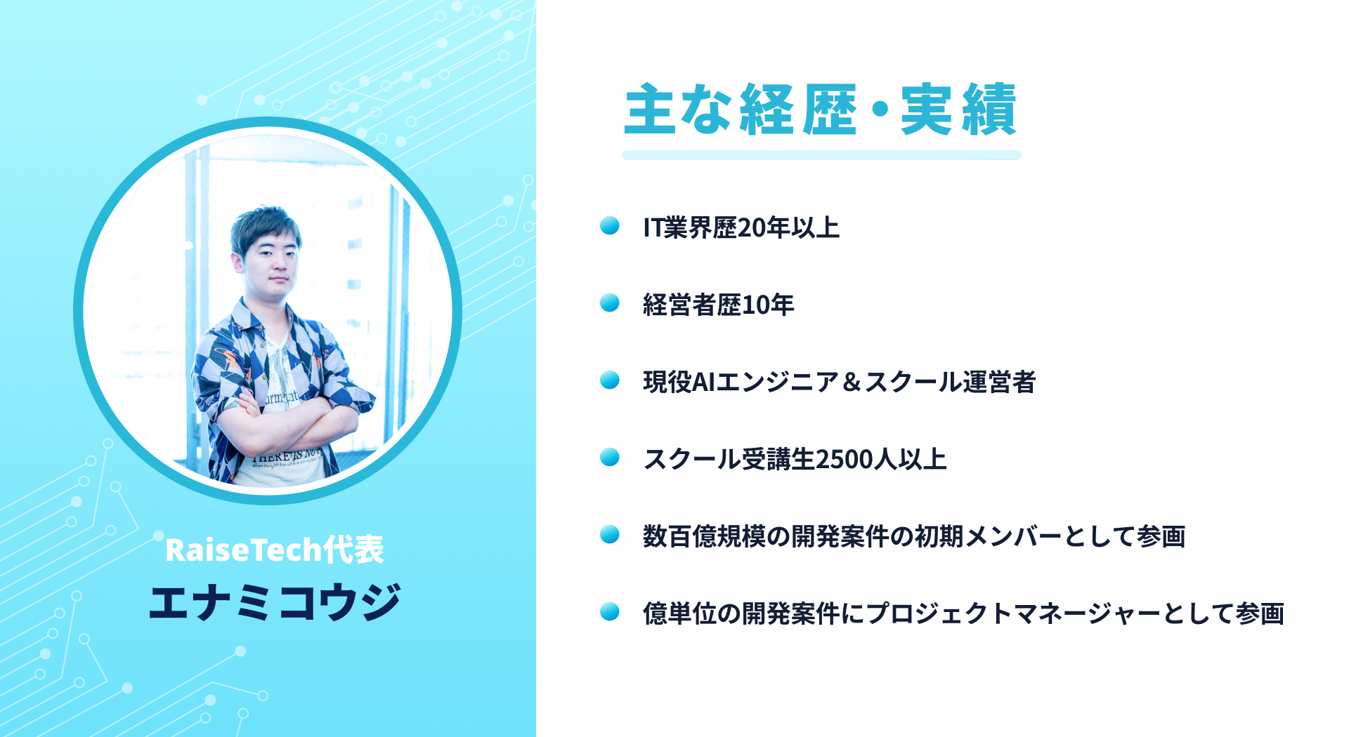 未経験から経験者まで幅広く学習できる環境を提供し、多くのエンジニアになりたい人、エンジニアとしてキャリアを積み上げていきたい人、AI時代に取り残されたくない人、そうした人たちの期待に応え、AIに使われるのではなく、AIを使いこなし、社会に新たな価値をスピーディに生み出せるエンジニアを一人でも多く輩出することが、本コースに込めたRaiseTechの想いです。