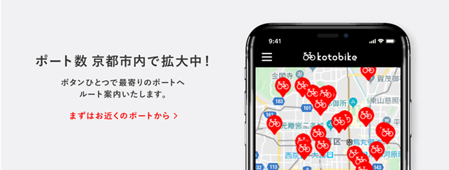 2019年にリリースしたkotobikeは、京都市内に約50箇所のポートを構える、国内唯一の自転車小売店がサービス設計・提供しているシェアサイクルサービスです。