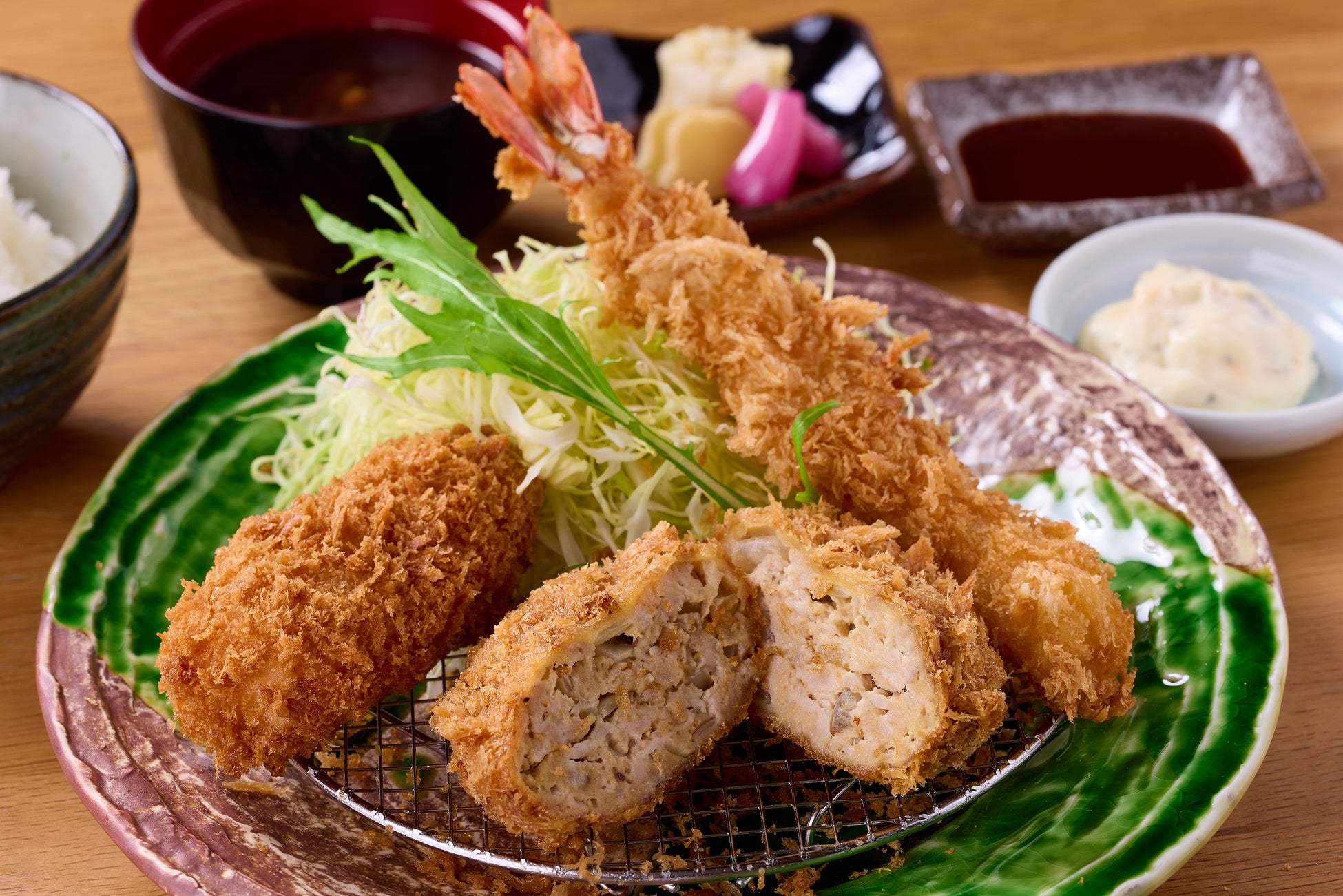 わさびおろしとの相性抜群な巧味豚ロースかつ御膳(160g 税抜2,700円、税込2,970円)や匠味豚ヒレかつ御膳(120g 税抜2,600円、税込2,860円)、ミックスフライ御膳(エビフライ、カニクリームコロッケ、塩メンチかつ)(税抜1,700円、税込1,870円)、三元豚ヒレかつ&カニクリームコロッケ御膳(税抜1,600円、税込1,760円)などのメニューをご用意しています。