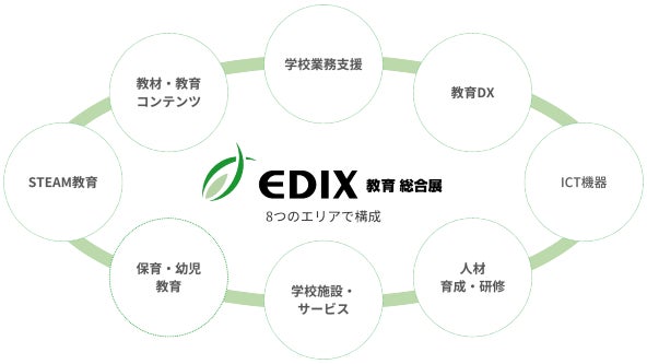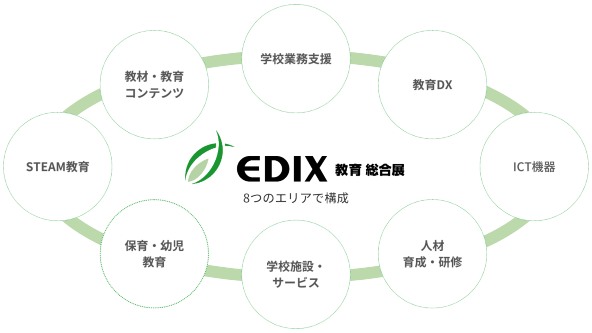 EDIXは、小・中・高等学校、大学などの教育機関をはじめとして、地方自治体や企業の人事部門など、教育にかかわる全ての方に向けた展示会です。それぞれの教育課題に寄り添った8つのエリアで構成されており、さまざまな製品・サービスについて、その場で直接相談・体験・導入が可能です。