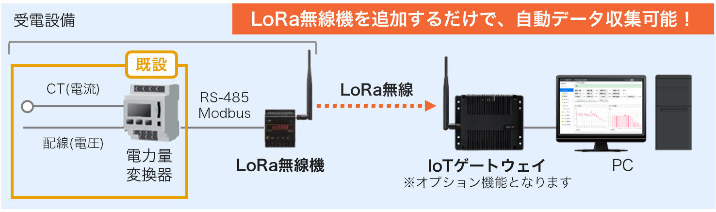 という政府方針が出されて以来、脱炭素対策として先ずは現状把握の位置づけで測定点を増やし、詳細に電力監視をしたいという声が日々増えています。LoRa無線機を活用することで、後付け簡単に電力測定点を増やし、配線工事なく事務所で遠隔電力監視を行うことができ、省エネへ繋げることができます。