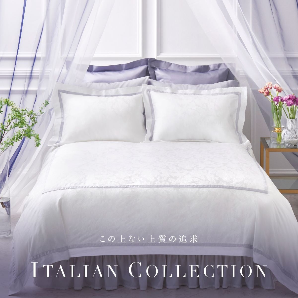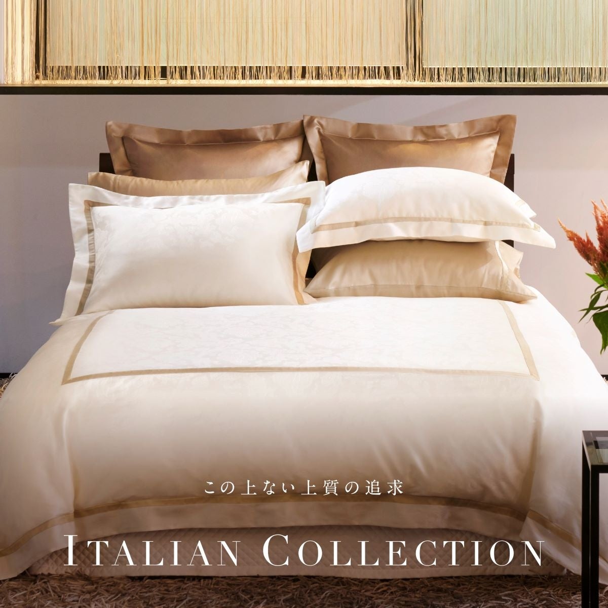 「イタリアンコレクション」は、イタリアの老舗テキスタイルメーカーと共創したベッドリネンシリーズです。この上なくやわらかな肌触りに加え、イタリア製ならではの美しい光沢とニュアンスのある絶妙なカラーリングを実現しました。同じトーンで重ねた色彩が、奥行きのあるモダンな空間を演出します。ホテルライクインテリアが提案する新しいラグジュアリーに、是非ご期待ください。