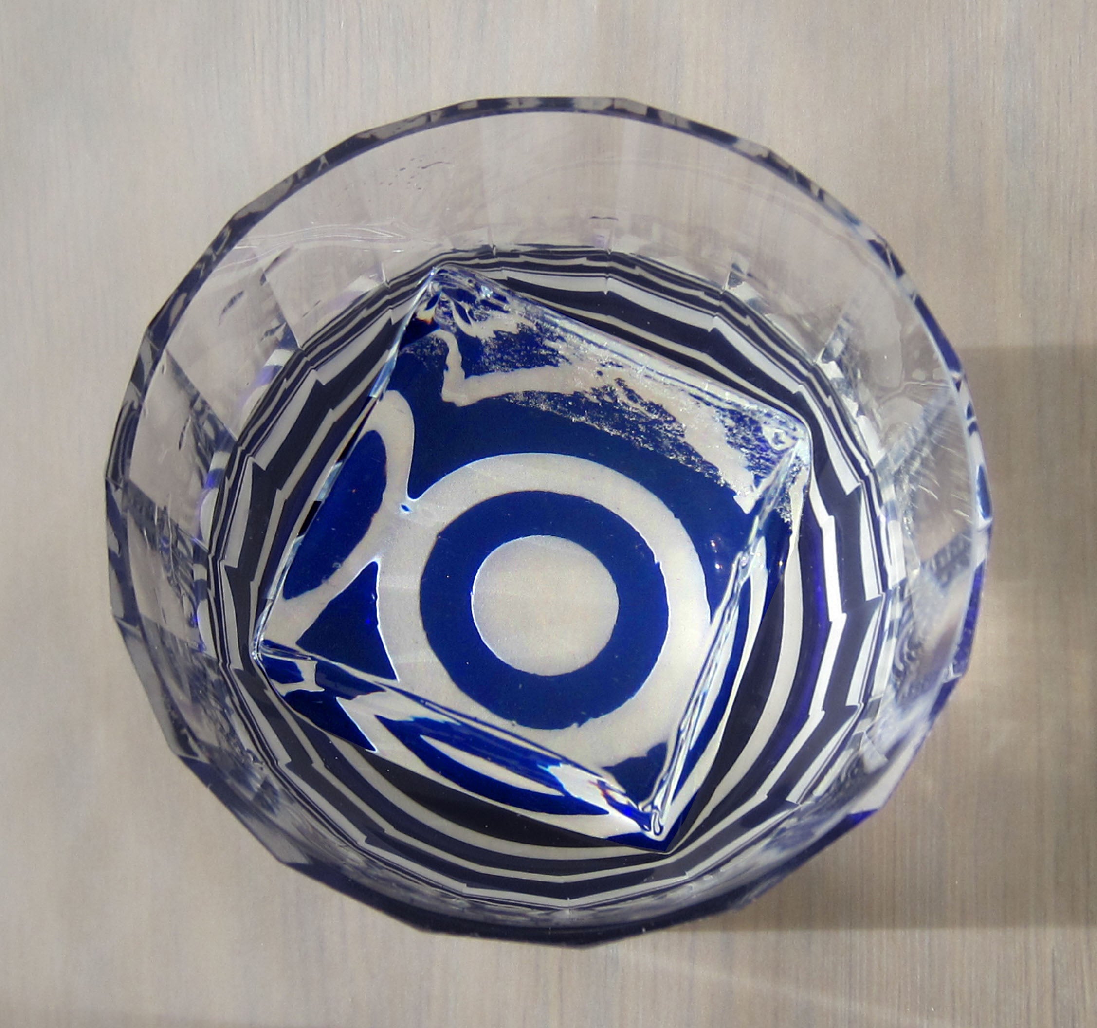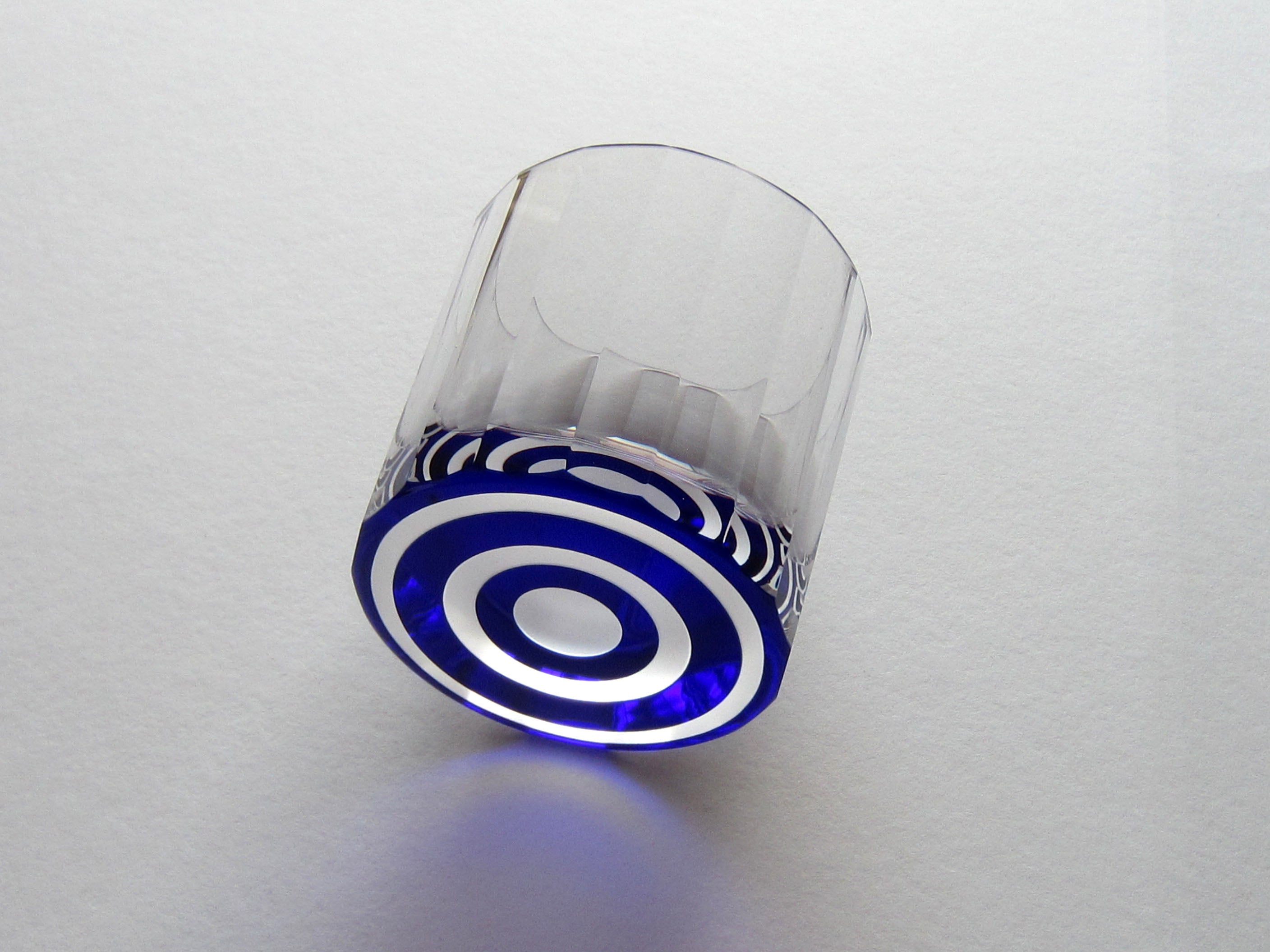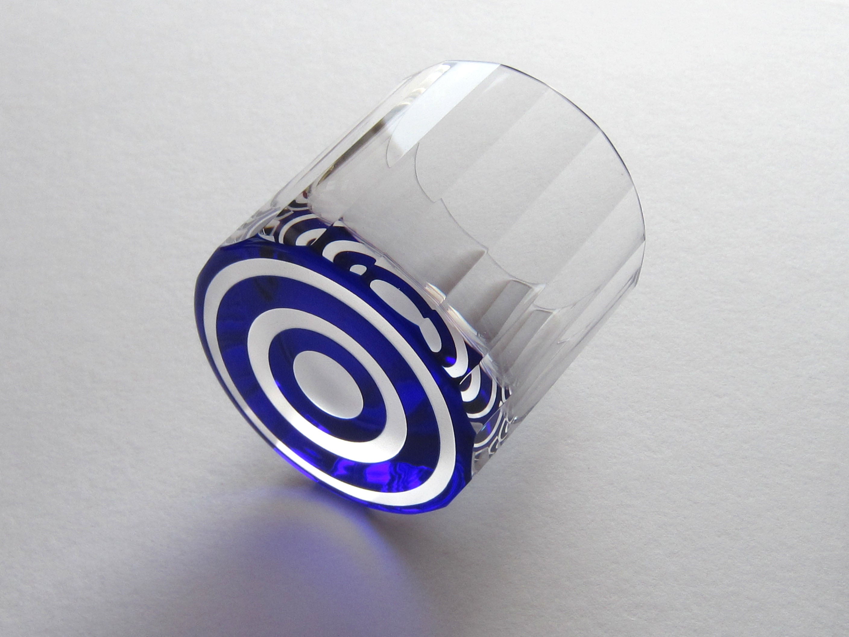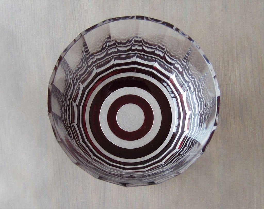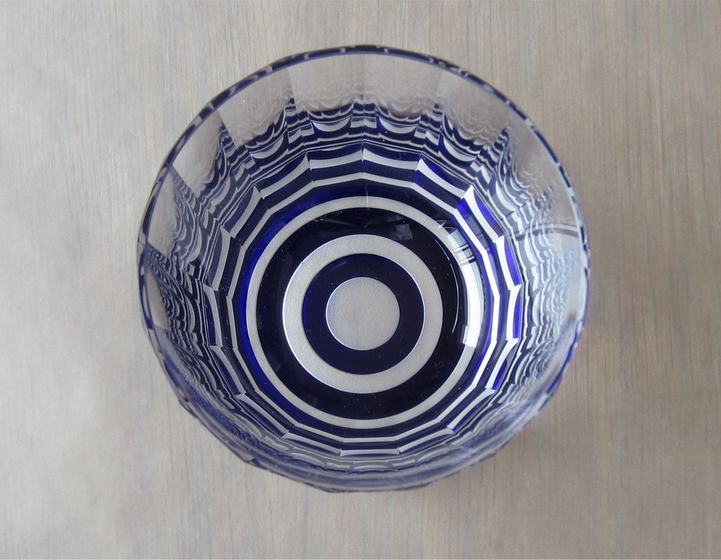 2.日本酒器としてお馴染みの蛇ノ目模様をモチーフに、江戸切子の技法の一つ「平切子」で側面を18面にカット、底をサンドブラストにて表現した「和酒専用江戸切子」