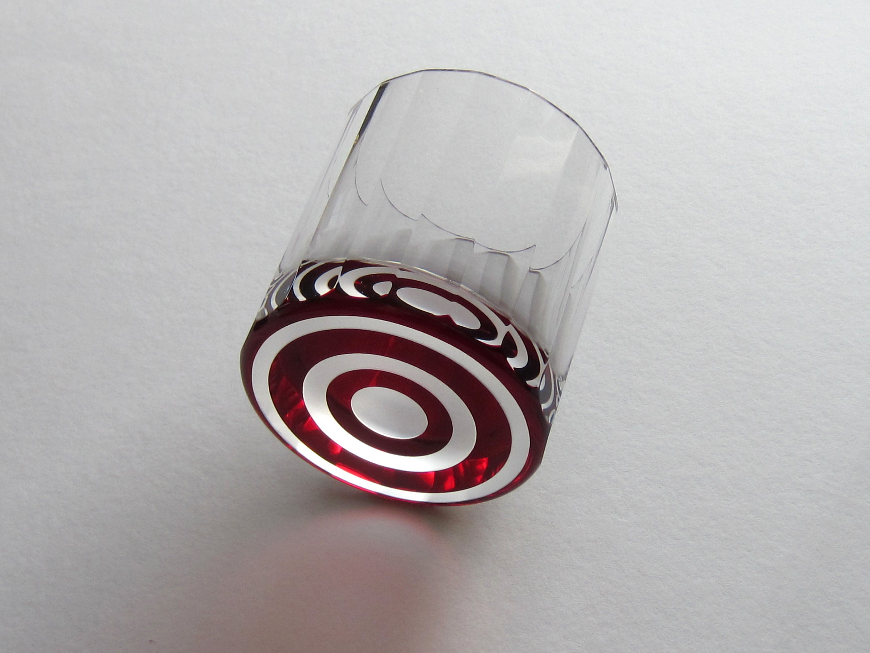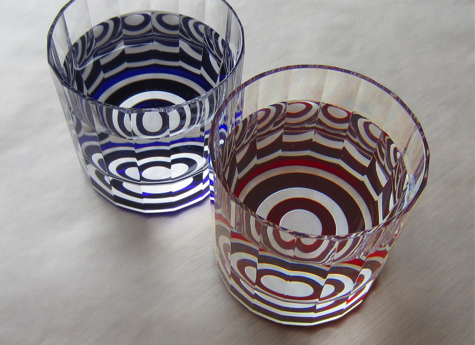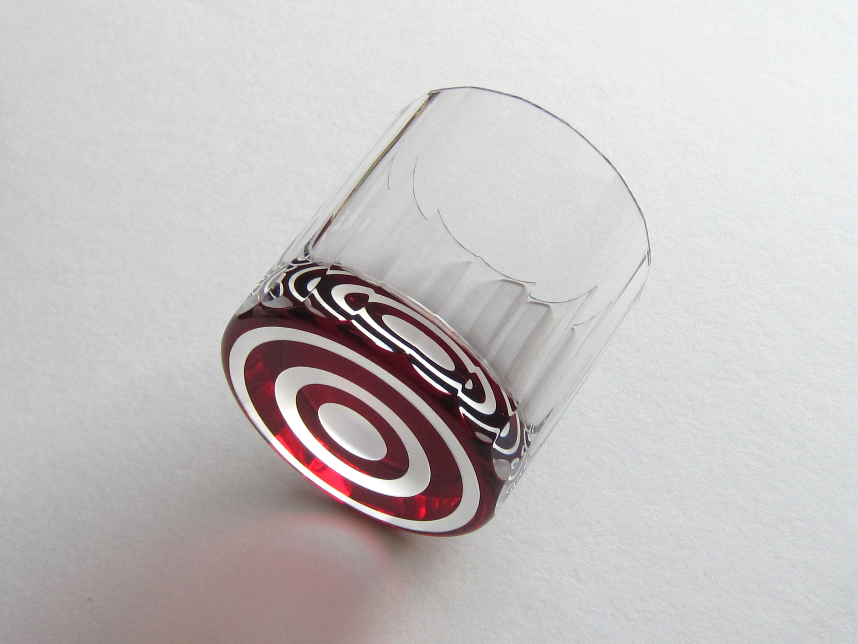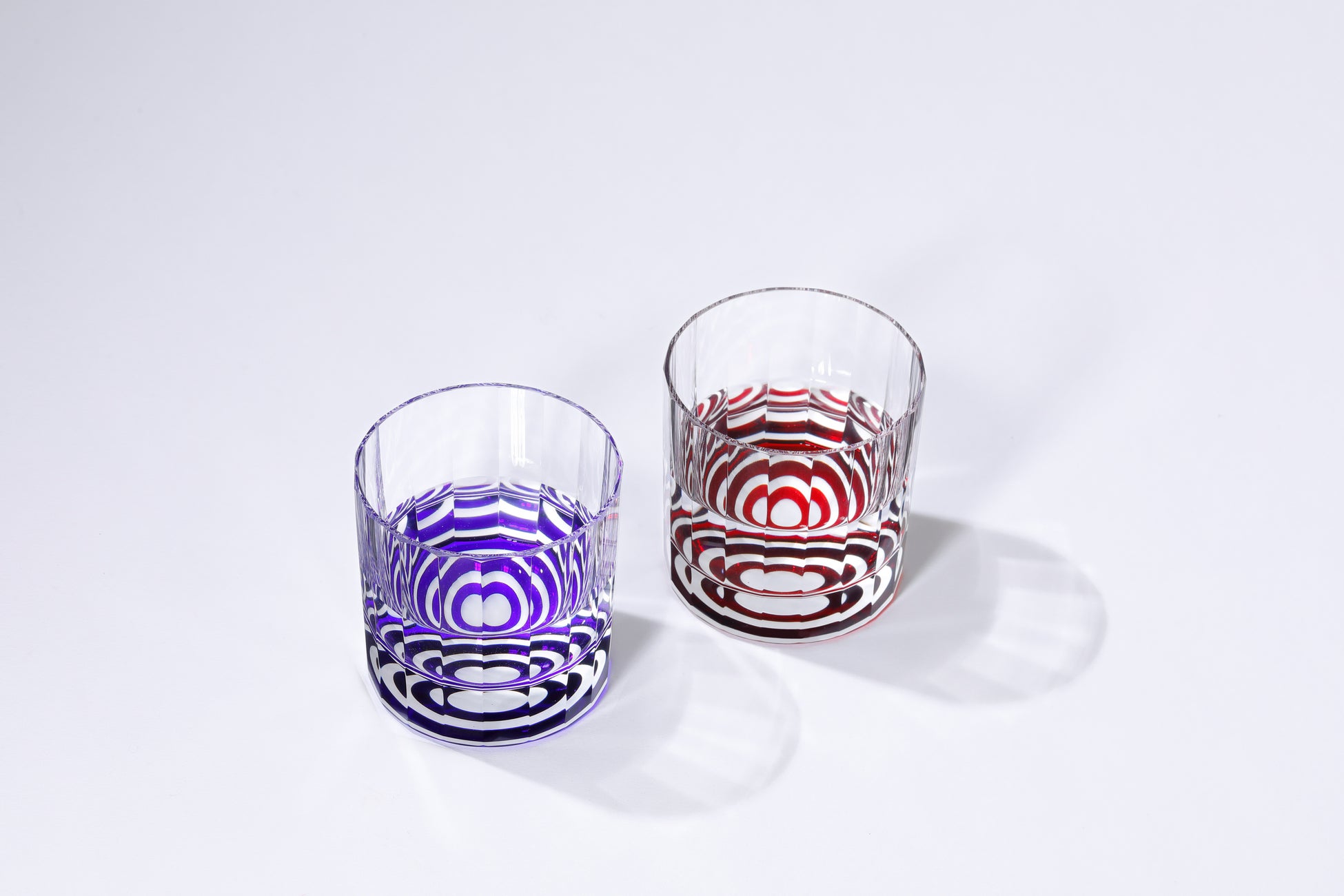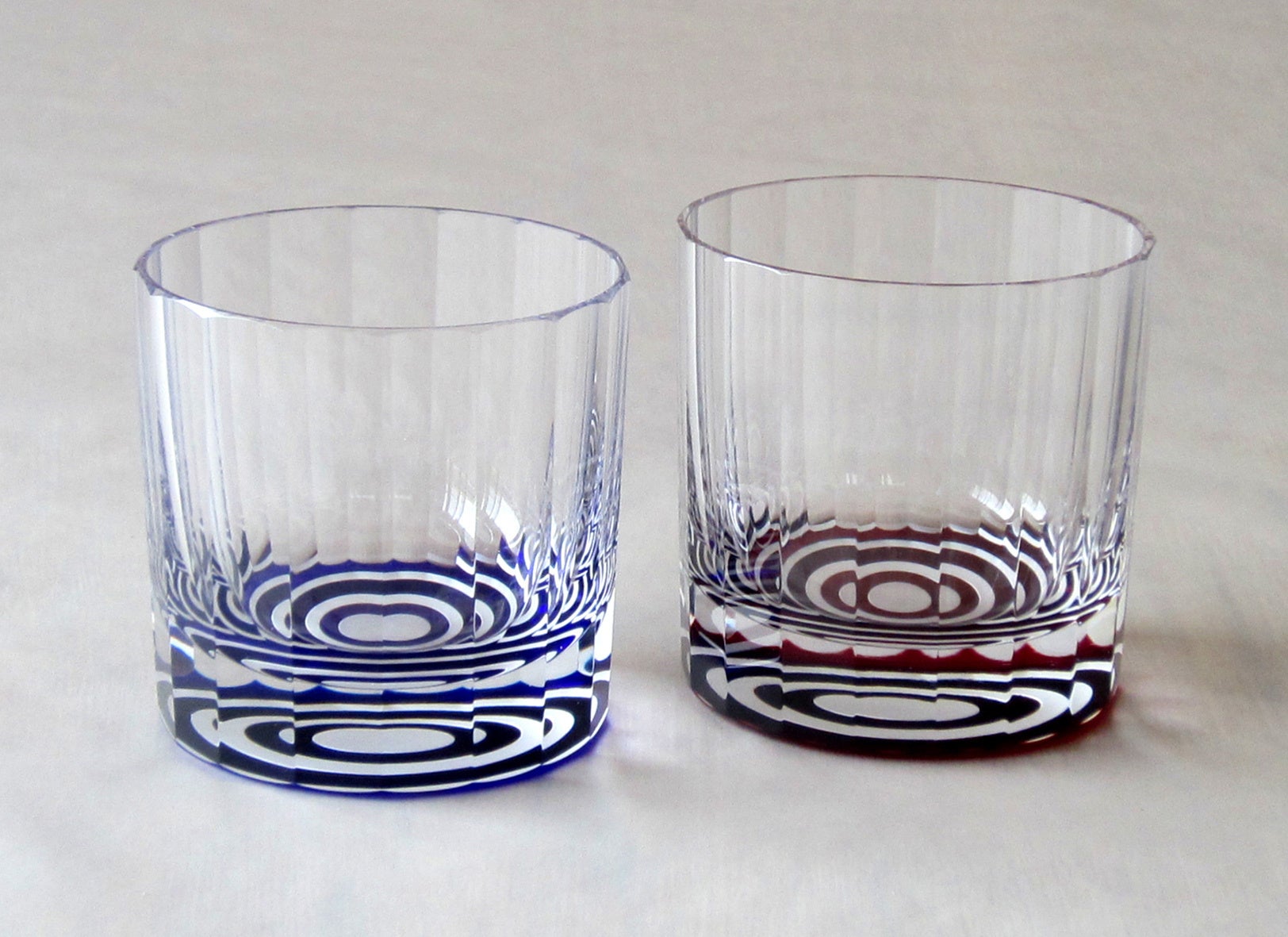 2.日本酒器としてお馴染みの蛇ノ目模様をモチーフに、江戸切子の技法の一つ「平切子」で側面を18面にカット、底をサンドブラストにて表現した「和酒専用江戸切子」