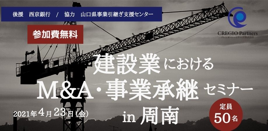 中国・四国地域を中心に、地域のM&A・事業承継を支援するクレジオ・パートナーズ株式会社は、山口県事業引継ぎ支援センターや、西京銀行の協力の下、後継者不在率が高く、事業承継に課題を持つ地域建設業の経営者を対象とした「建設業におけるM&A・事業承継セミナー in 周南」を開催します。