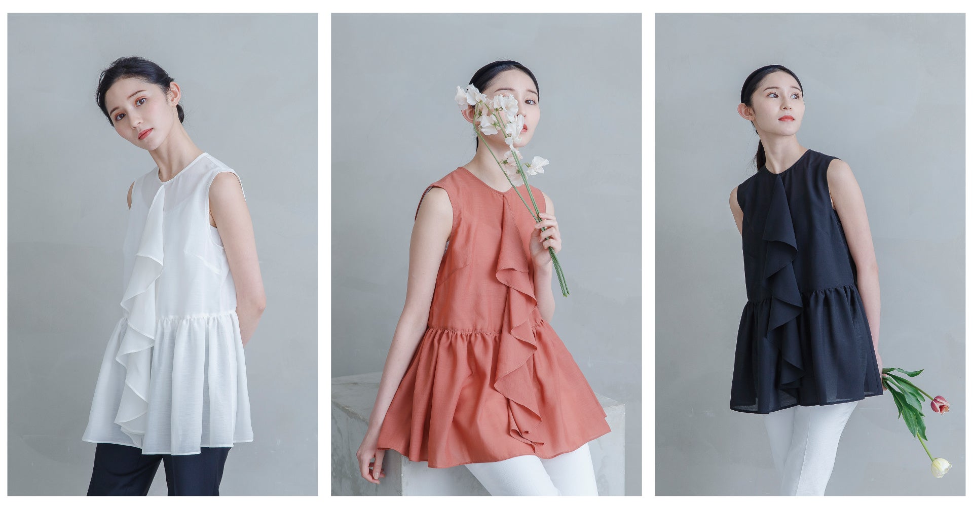 “プリマクアの顔”であるフリルを大胆にあしらった、一枚で主役級のペプラムブラウス。