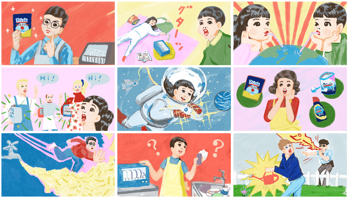 クイズを見ながら、私自身も「へぇー!そうだったんだ~」と、膝を打ちながらイラストを描きました。私事ですが、この作業中に、たまたま食洗機を使い始め、楽になったけど、無駄遣いしてないかしら?とドキドキしていたのだけど、なんと食洗機の方が節水になると知り、ビックリ。途端に胸を張る私です。食洗機バンザイ!