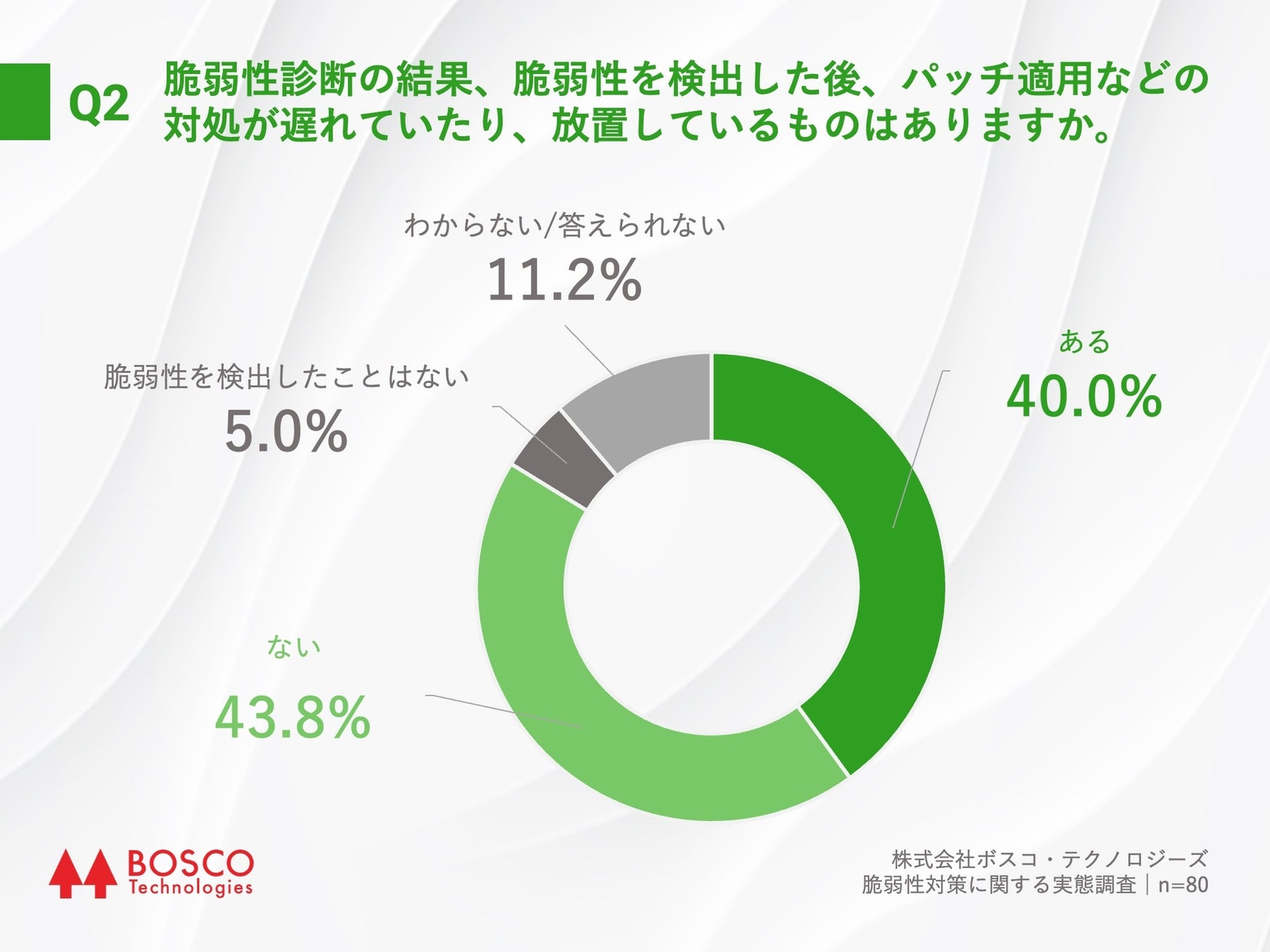 Q1で「実施している」と回答した方に、「Q2.脆弱性診断の結果、脆弱性を検出した後、パッチ適用などの対処が遅れていたり、放置しているものはありますか。」(n=80)と質問したところ、「ある」が40.0%、「ない」が43.8%という回答となりました。