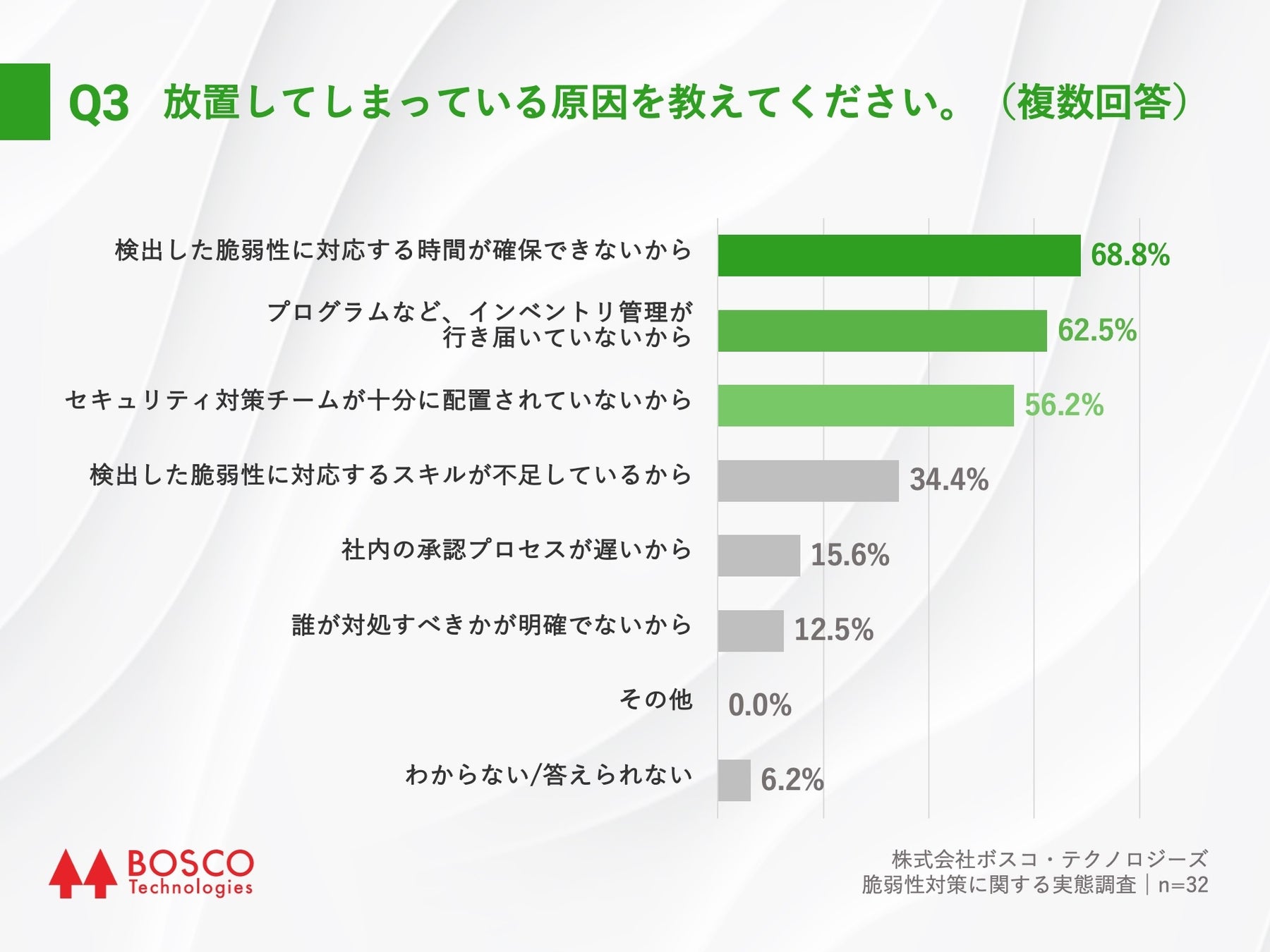 Q2で「ある」と回答した方に、「Q3.放置してしまっている原因を教えてください。(複数回答)」(n=32)と質問したところ、「検出した脆弱性に対応する時間が確保できないから」が68.8%、「プログラムなど、インベントリ管理が行き届いていないから」が62.5%、「セキュリティ対策チームが十分に配置されていないから」が56.2%という回答となりました。