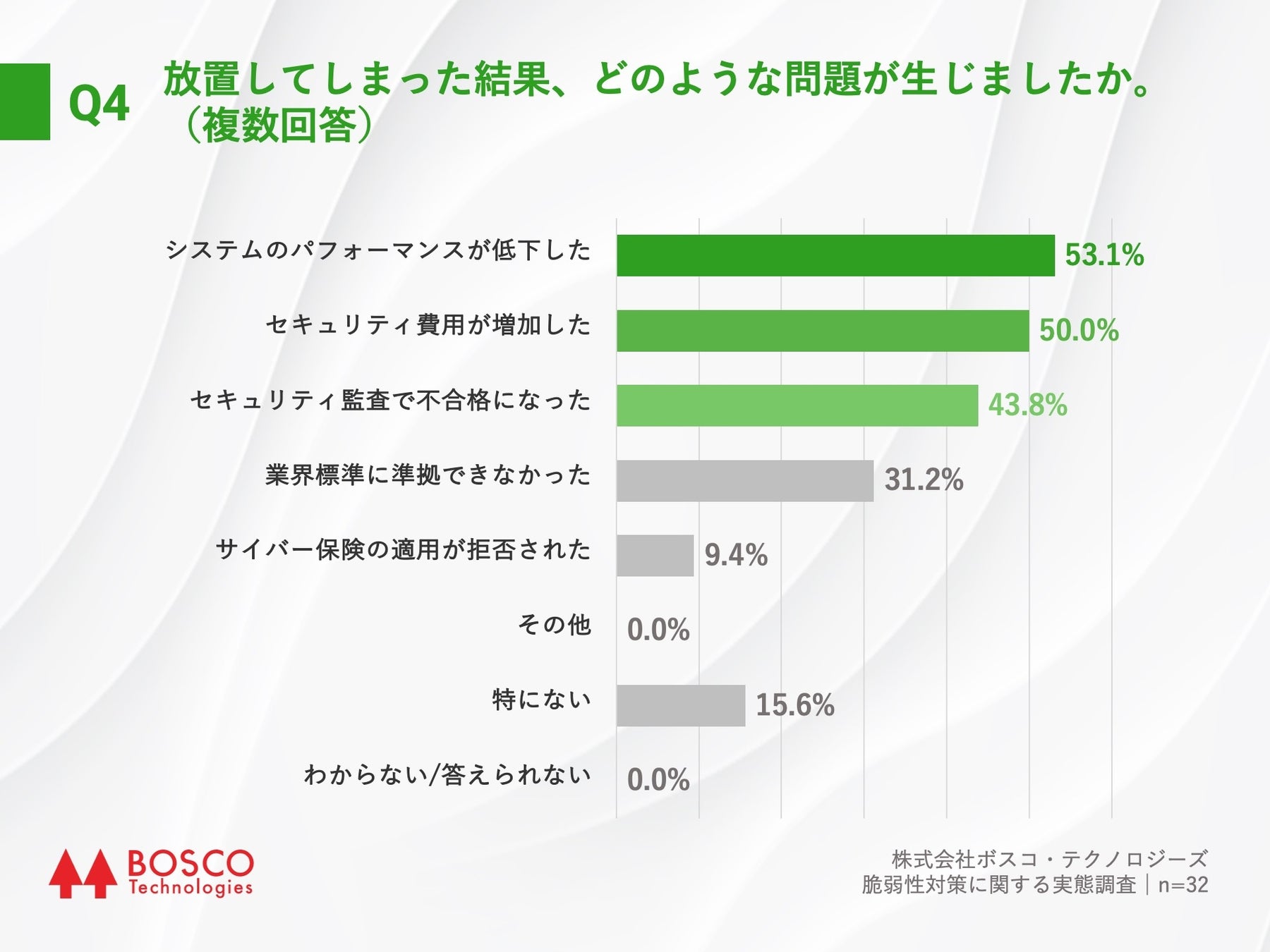 Q2で「ある」と回答した方に、「Q4.放置してしまった結果、どのような問題が生じましたか。(複数回答)」(n=32)と質問したところ、「システムのパフォーマンスが低下した」が53.1%、「セキュリティ費用が増加した」が50.0%、「セキュリティ監査で不合格になった」が43.8%という回答となりました。