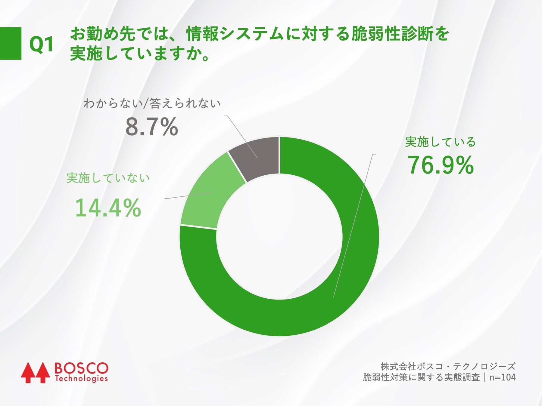 「Q1.お勤め先では、情報システムに対する脆弱性診断を実施していますか。」(n=104)と質問したところ、「実施している」が76.9%、「実施していない」が14.4%という回答となりました。