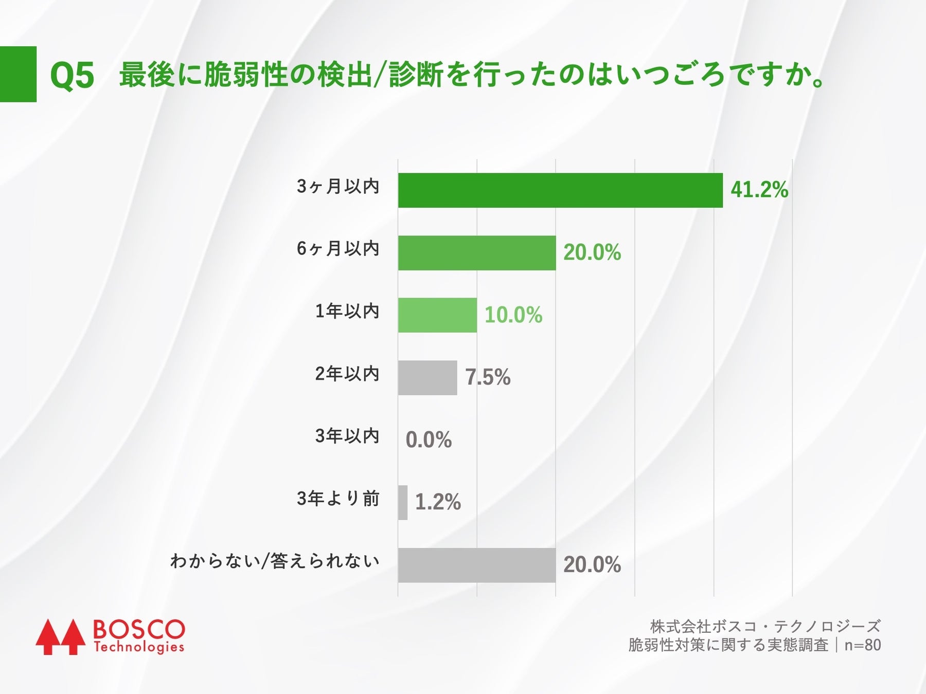 Q1で「実施している」と回答した方に、「Q5.最後に脆弱性の検出/診断を行ったのはいつごろですか。」(n=80)と質問したところ、「3ヶ月以内」が41.2%、「6ヶ月以内」が20.0%、「1年以内」が10.0%という回答となりました。