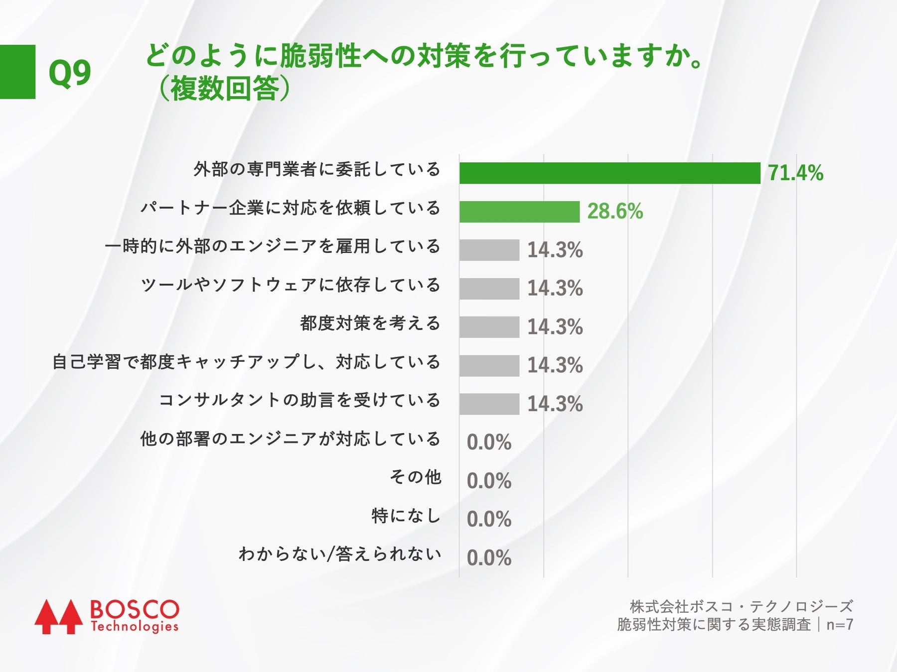 Q8で「いいえ」と回答した方に、「Q9.どのように脆弱性への対策を行っていますか。(複数回答)」(n=7)と質問したところ、「外部の専門業者に委託している」が71.4%、「パートナー企業に対応を依頼している」が28.6%という回答となりました。