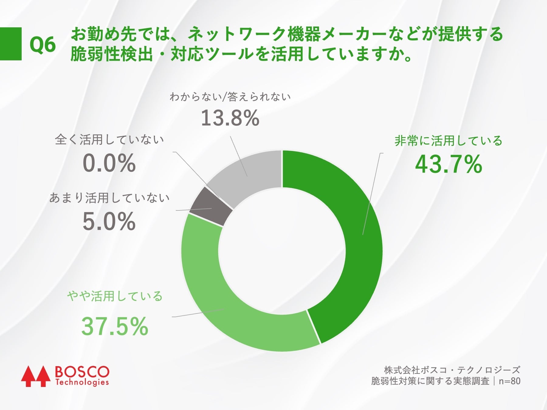 Q1で「実施している」と回答した方に、「Q6.お勤め先では、ネットワーク機器メーカーなどが提供する脆弱性検出・対応ツールを活用していますか。」(n=80)と質問したところ、「非常に活用している」が43.7%、「やや活用している」が37.5%という回答となりました。