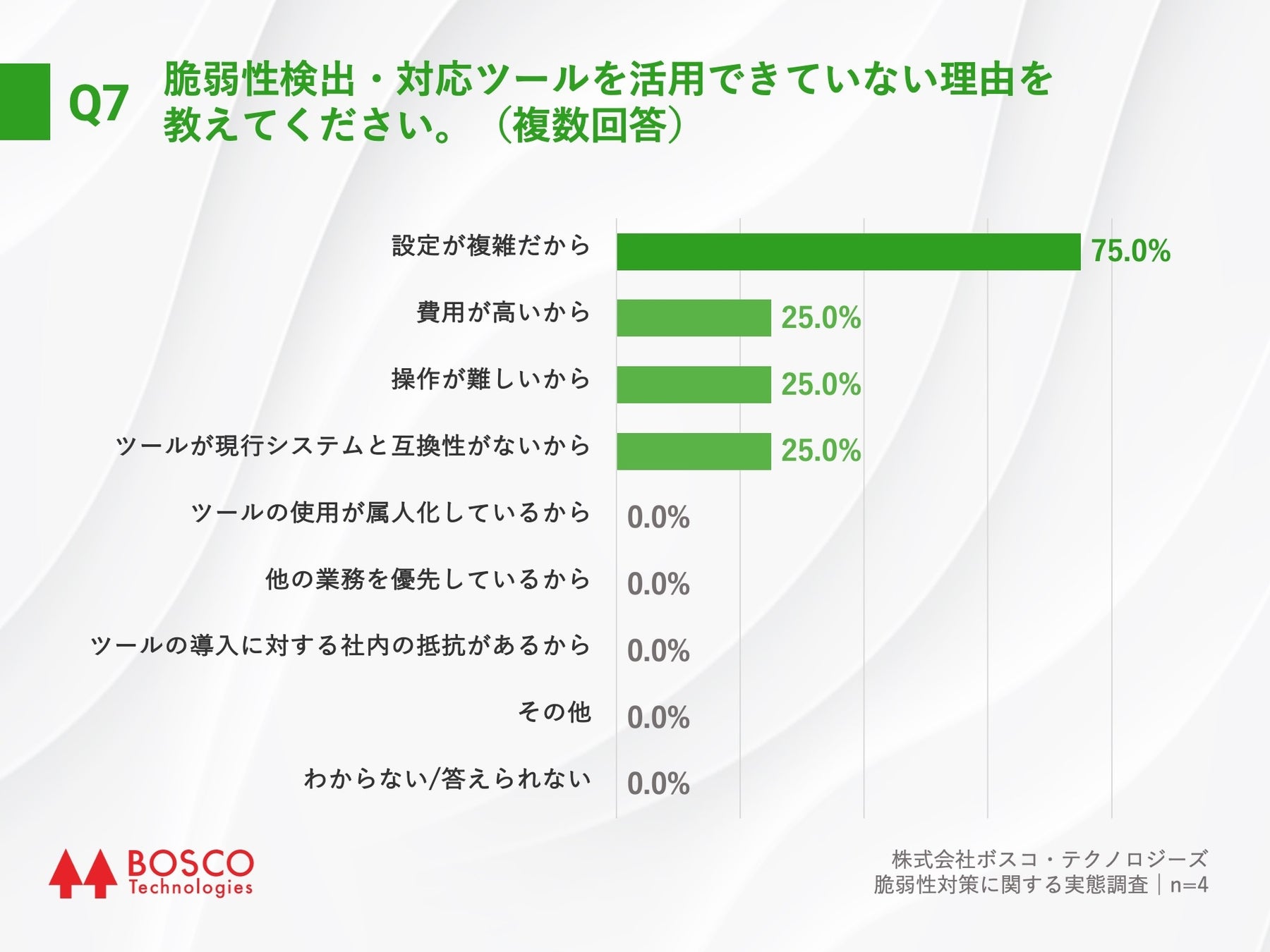 Q6で「あまり活用していない」「全く活用していない」と回答した方に、「Q7.脆弱性検出・対応ツールを活用できていない理由を教えてください。(複数回答)」(n=4)と質問したところ、「設定が複雑だから」が75.0%という回答となりました。