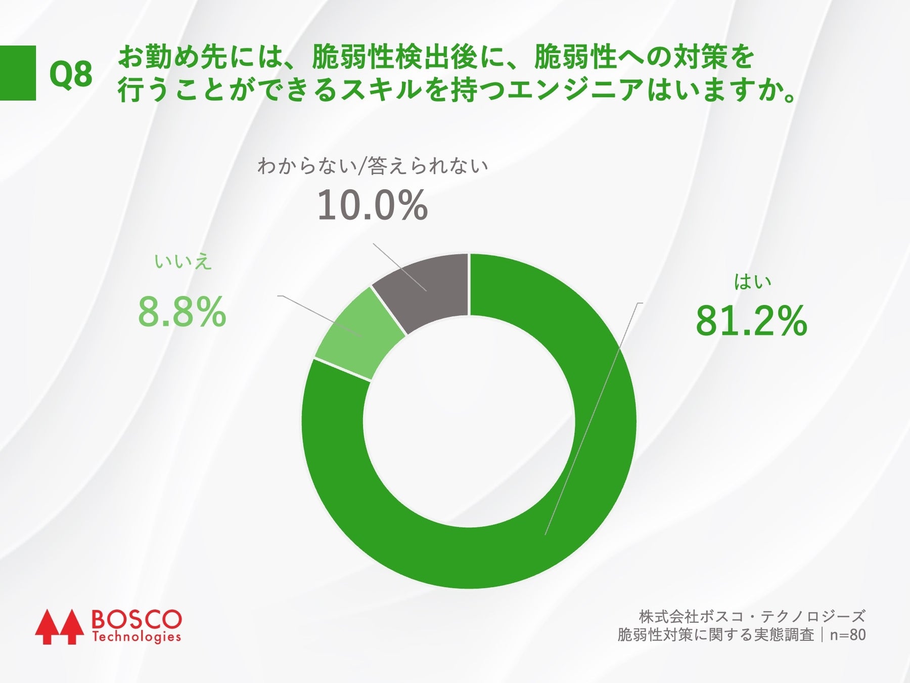 Q1で「実施している」と回答した方に、「Q8.お勤め先には、脆弱性検出後に、脆弱性への対策を行うことができるスキルを持つエンジニアはいますか。」(n=80)と質問したところ、「はい」が81.2%、「いいえ」が8.8%という回答となりました。