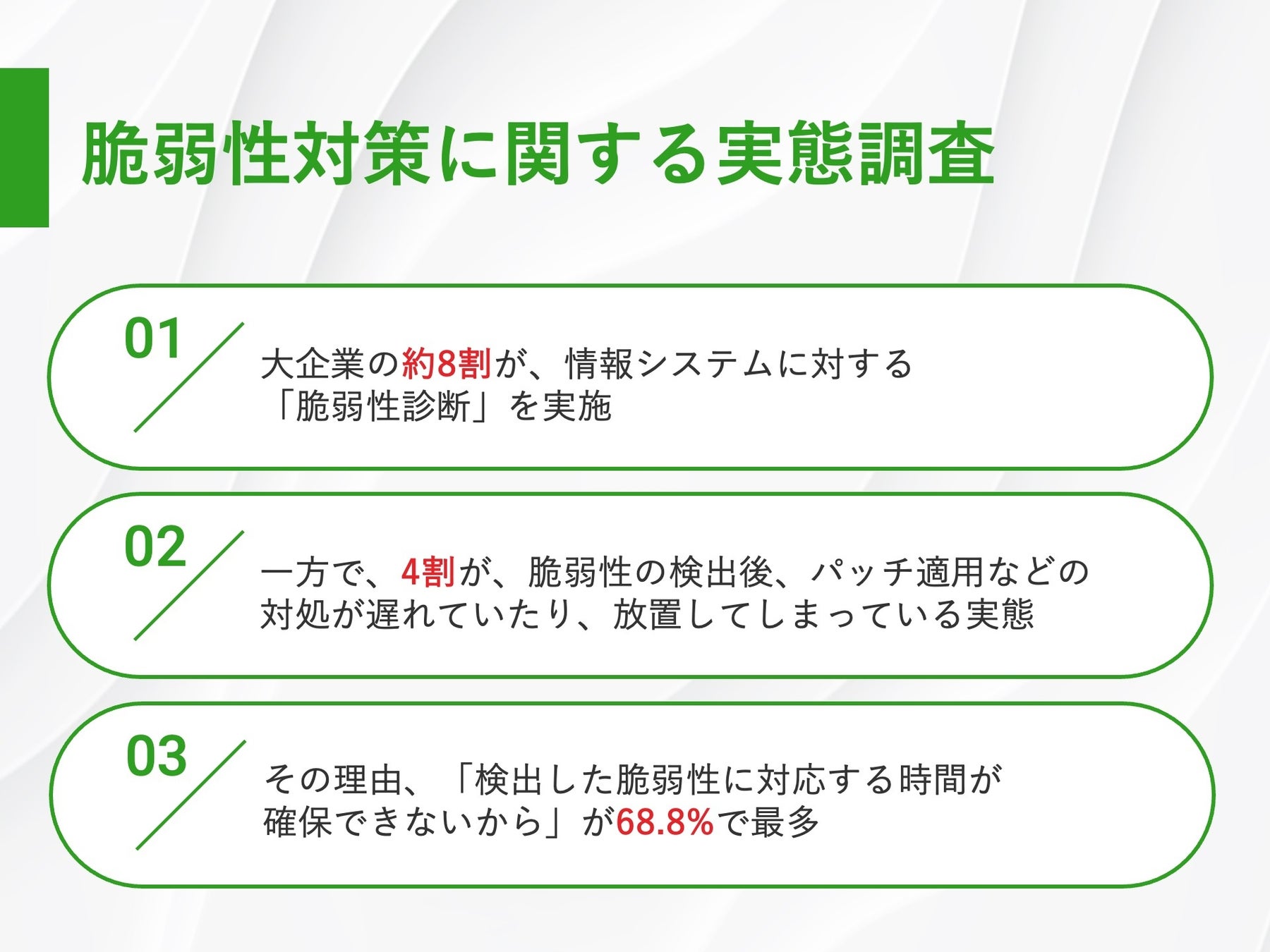 まず、大企業の約8割が、情報システムに対する脆弱性診断を実施していますが、うち4割が、脆弱性の検出後、「パッチ適用などの対処が遅れていたり、放置しているものがある」と回答しており、その理由について、68.8%が「対応する時間が確保できない」を挙げました。また、脆弱性を放置してしまった結果、「システムのパフォーマンスが低下した」(53.1%)や「セキュリティ費用が増加した」(50.0%)などの問題が生じており、41.2%が「3ヶ月以内」に脆弱性を診断/検出した実態があります。さらに、81.2%が、ネットワーク機器メーカーなどが提供する「脆弱性検出・対応ツール」を活用しており、脆弱性対策ができるエンジニアが社内にいる企業は81.2%に上ることが分かりました。