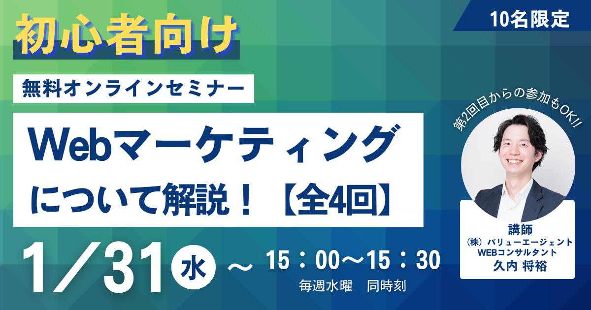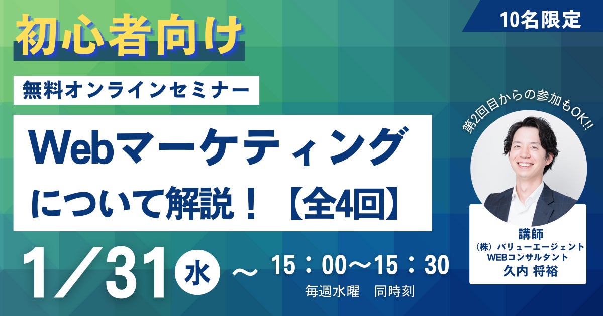 中小企業を対象にしたWebマーケティングなどを手がけている株式会社バリューエージェント(本社:大阪府大阪市、代表取締役:上野山 光雄)は、オンラインセミナー「【初心者向け】Webマーケティングについて解説!」を2024年1月31日(水)~2024年2月21日(水)まで毎週水曜日4回連続で開催いたします。時間は午後3時から3時30分まで。Webマーケティングは難しそう、何から初めて良いかわからないというお悩みを解決する内容で、参加費は無料です。