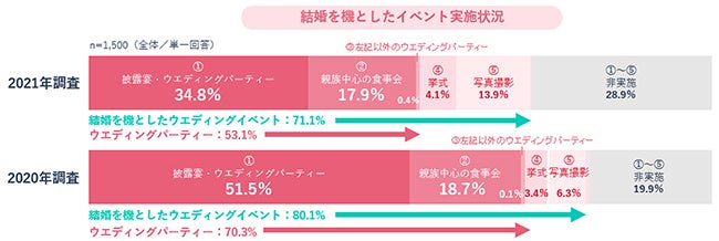 1年後の2020年4月~2021年3月に結婚した20~49歳の既婚者の調査では、ウエディングパーティーの実施率は約5割と、コロナ禍もあり昨年調査時と比較してさらに2割弱実施率が低下しました。