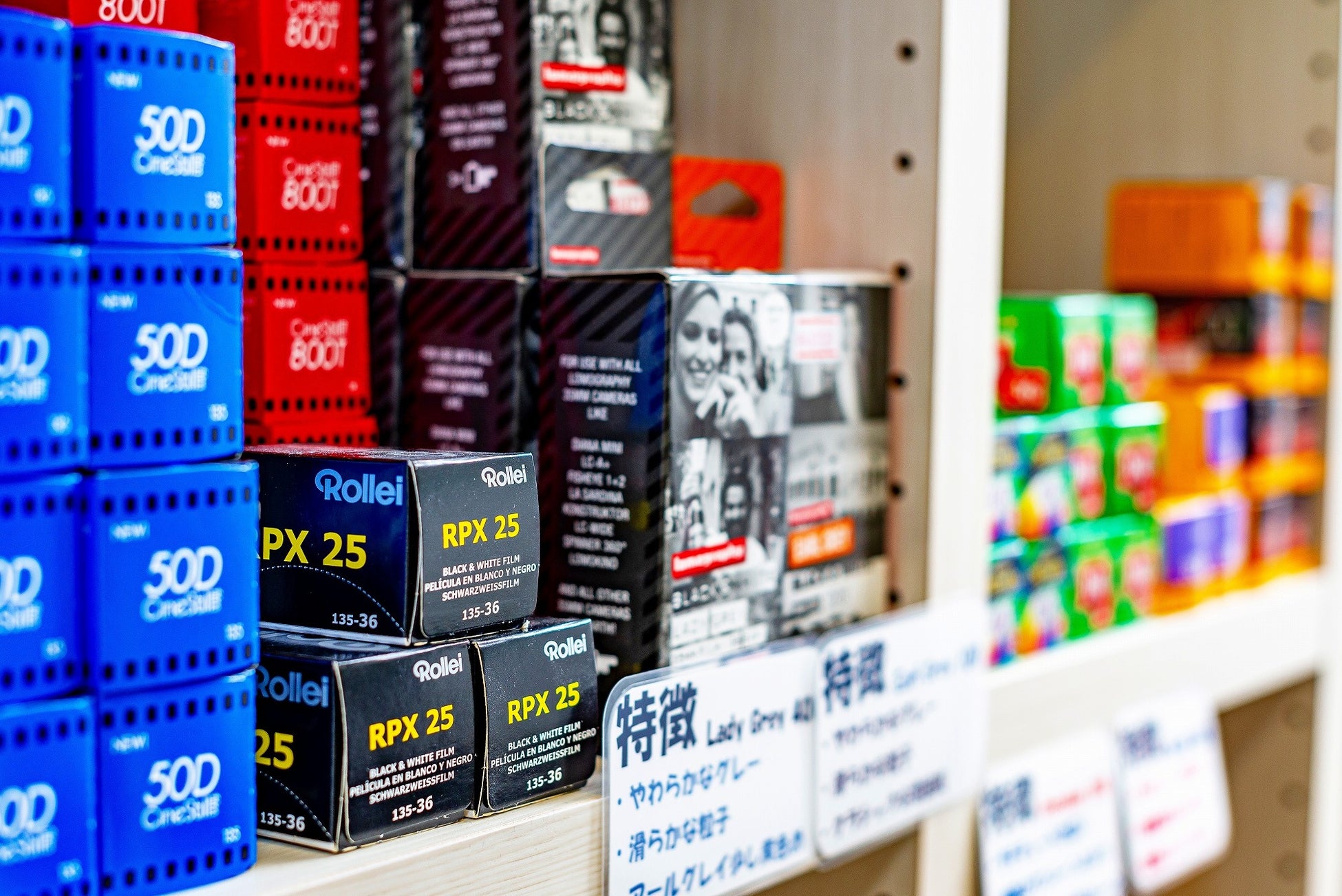 関東最大級のフィルムのセレクション。35mm、120フイルム、新品チェキとチェキ用フィルムも充実。