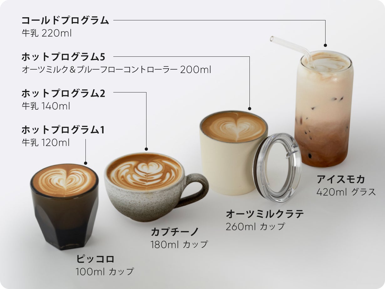 お好みのメニューも自由自在、カプチーノ、カフェラテは勿論のこと、アイスメニューや代用乳でもご使用いただけます。