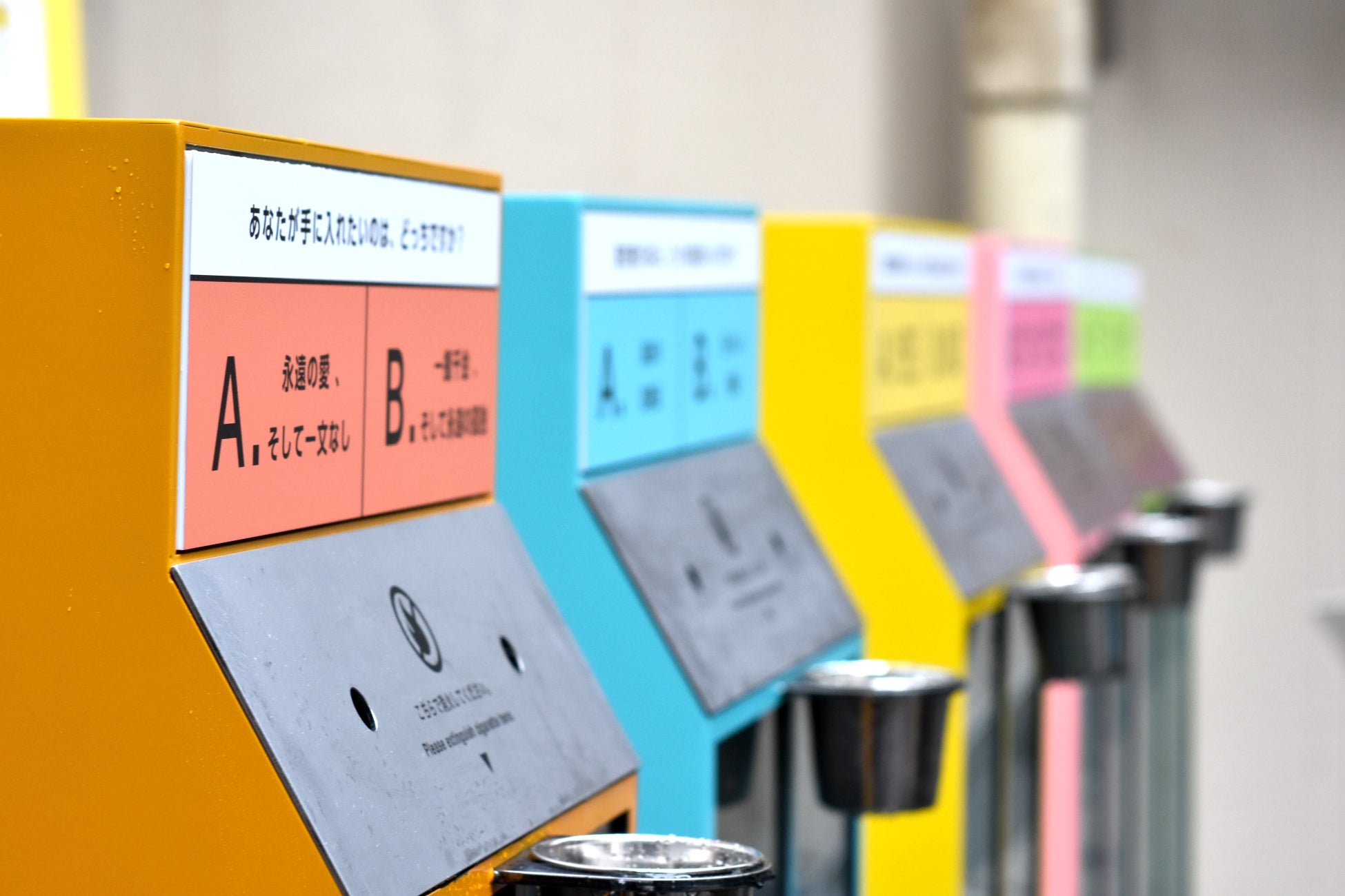 楽しみながらポイ捨てを減らすことを目的に、投票型灰皿をポイ捨ての多いエリアである宇多川クランクストリートに5台設置します。「人生に大事なのは金か、愛か」など、誰しもが悩む究極の2択の投票内容を投票型灰皿に掲載。ポイ捨てをせず、灰皿に能動的に吸い殻を捨てたくなる仕組みにしています。5台の灰皿は投票内容も色も異なり、期間中はポイ捨てを減らすための「投票型喫煙所」へとストリート全体が変化します。