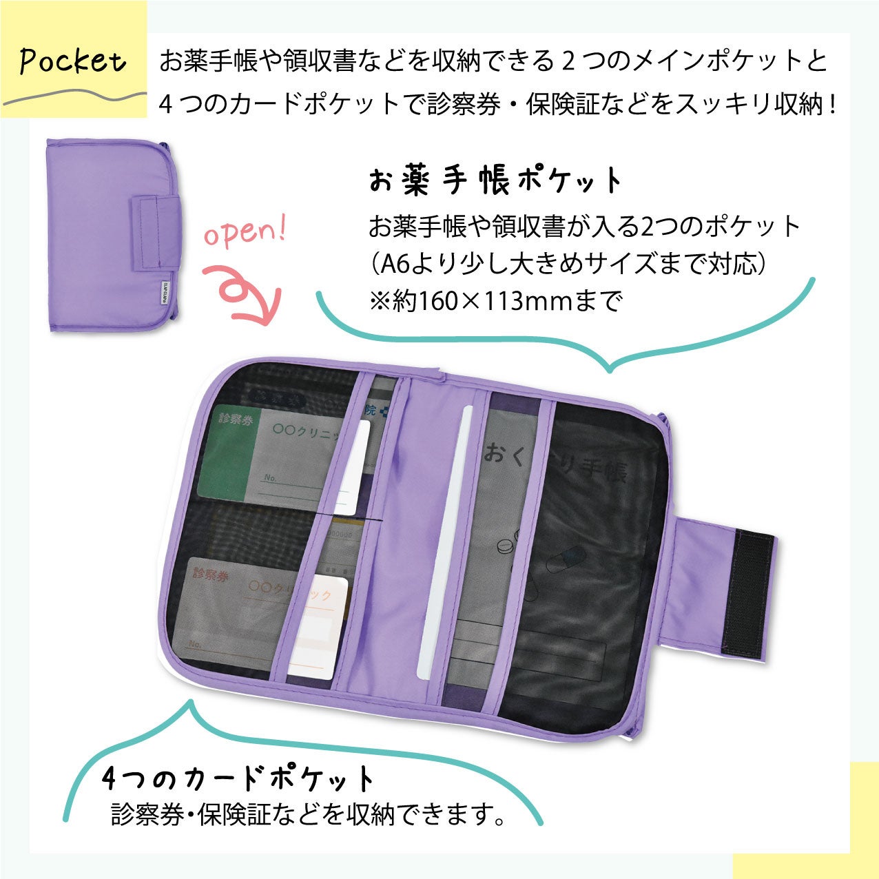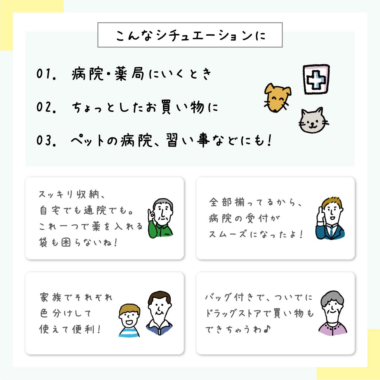 診察券や保険証などのカード類はもちろん、受け取った薬を収めることもできるお買い物バッグも付属しており、有料のビニール袋を買わずに済むので、エコで経済的です。