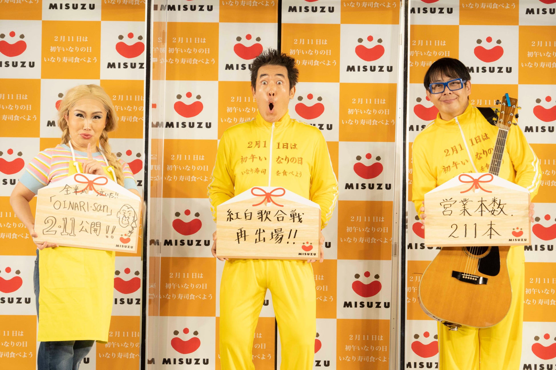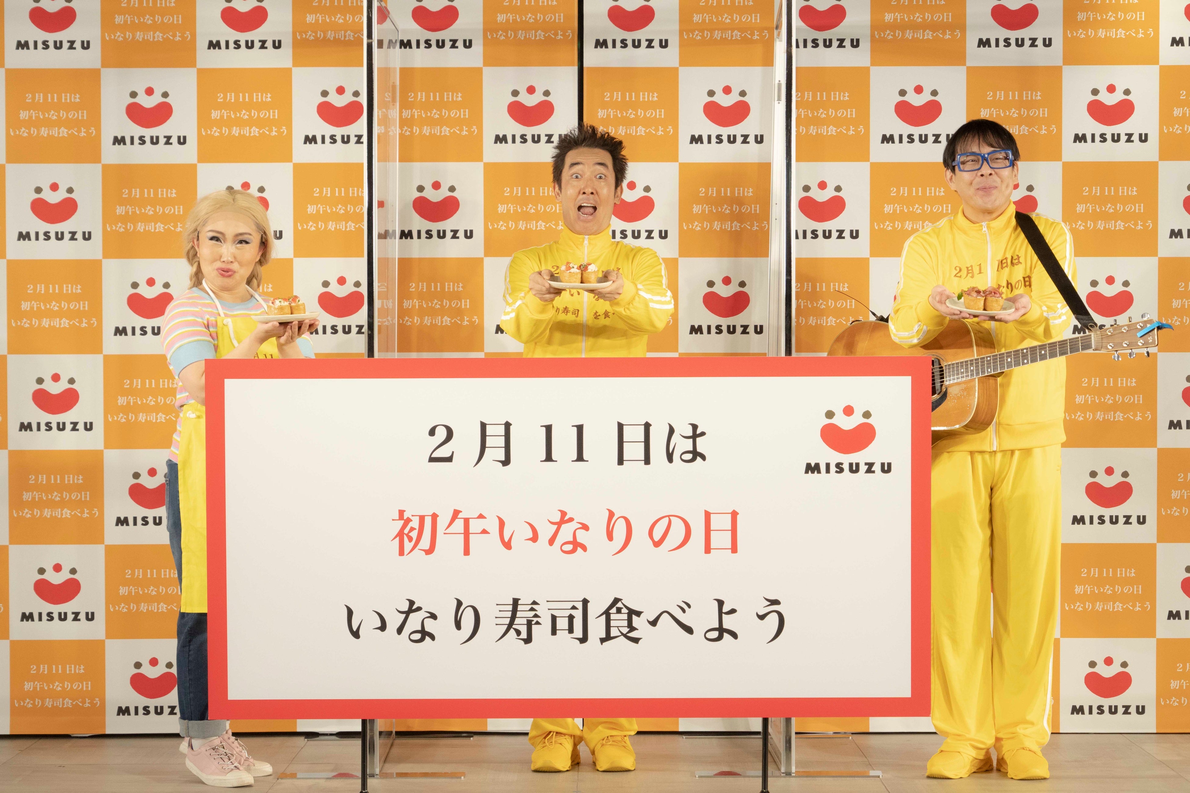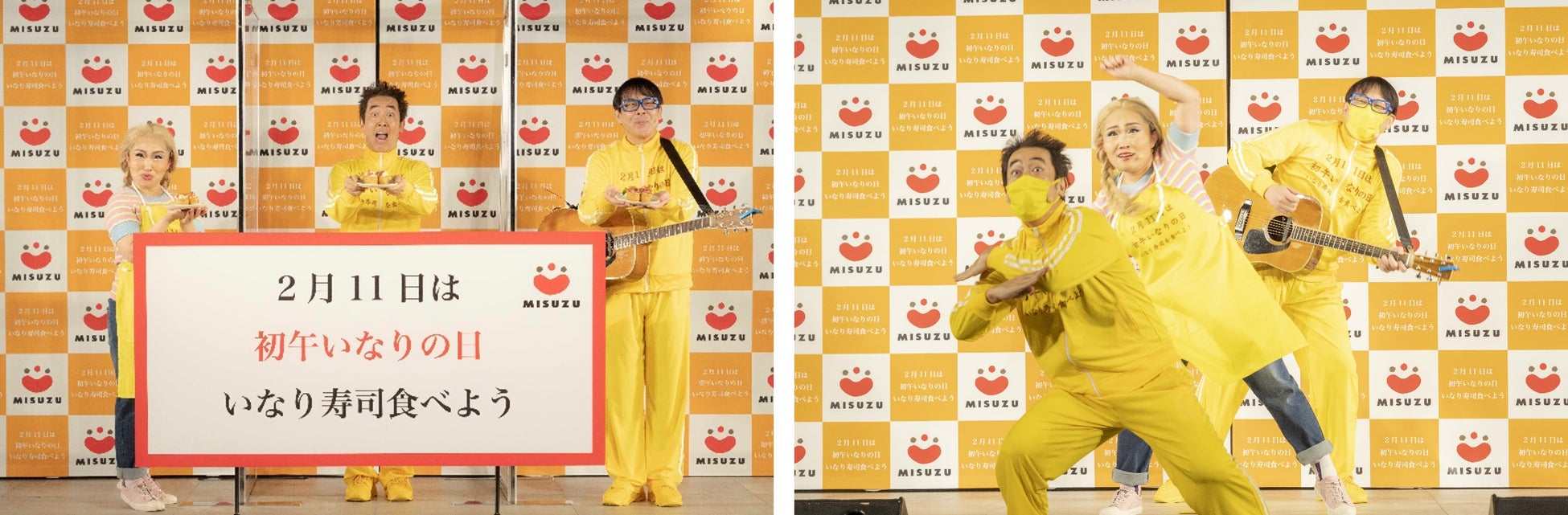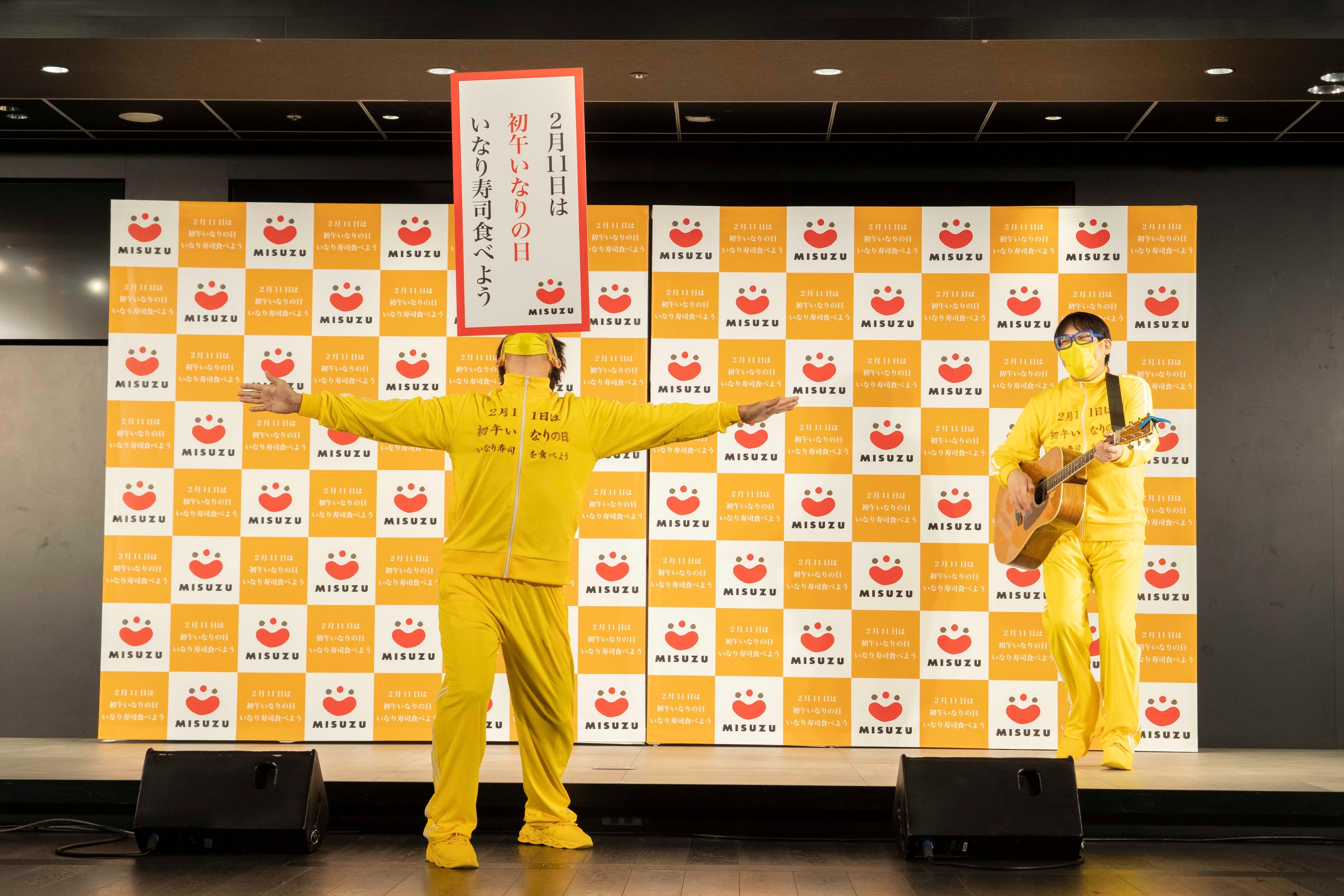 その後、この日のために作ったオリジナルソング「なんでだろう~初午いなりの日ver.~」を披露いただきました。「2月11日に、いなり寿司を食べるのなんでだろう」 「全国には様々な種類のいなり寿司があるけど、テツの顔が“棒いなり”に見えるのなんでだろう」など、初午いなりの日やいなり寿司にまつわる“なんでだろう”を連発し、イベントを盛り上げていただきました。
