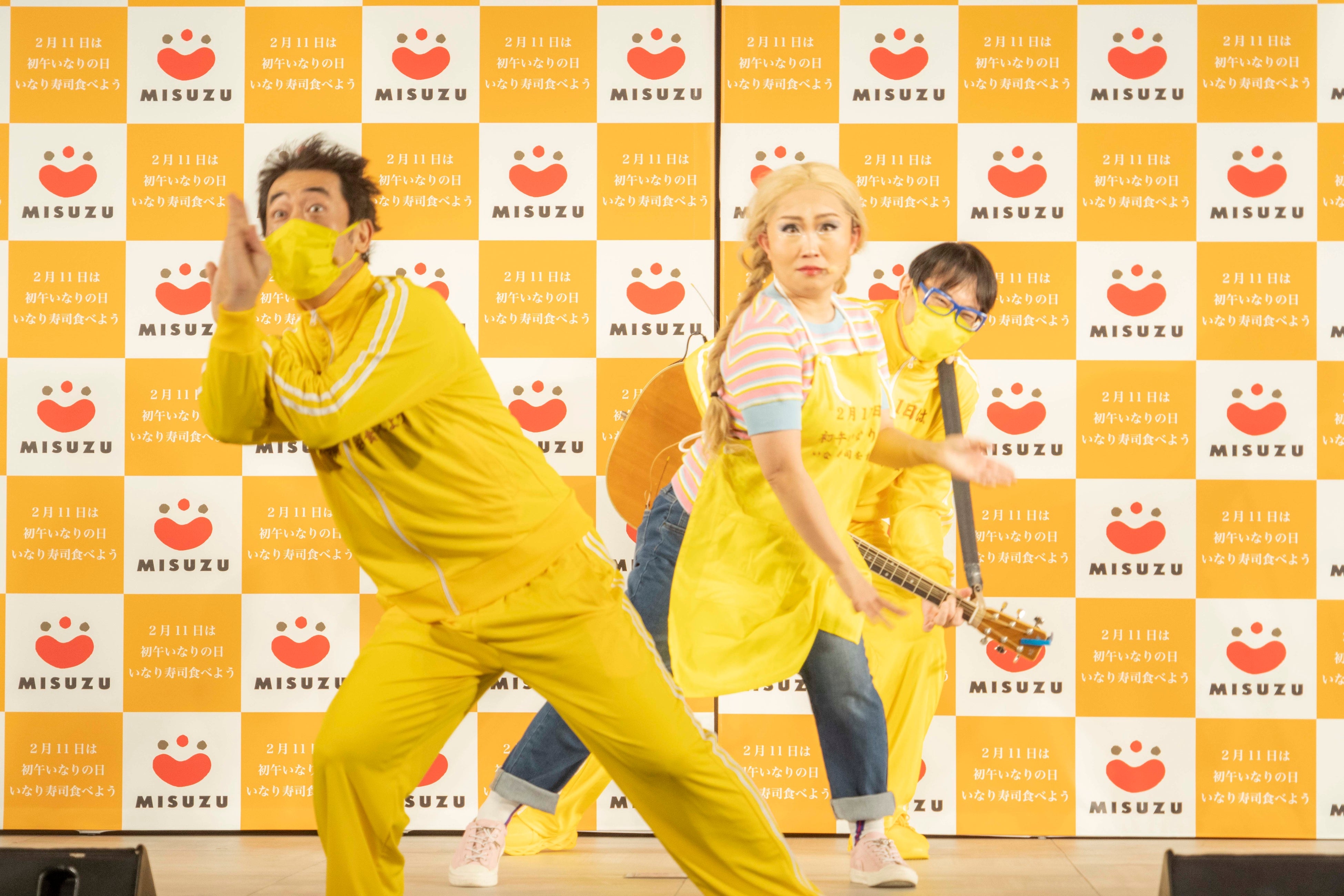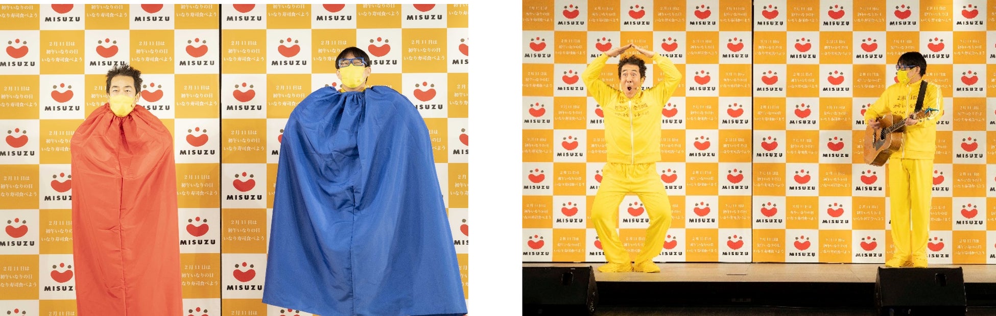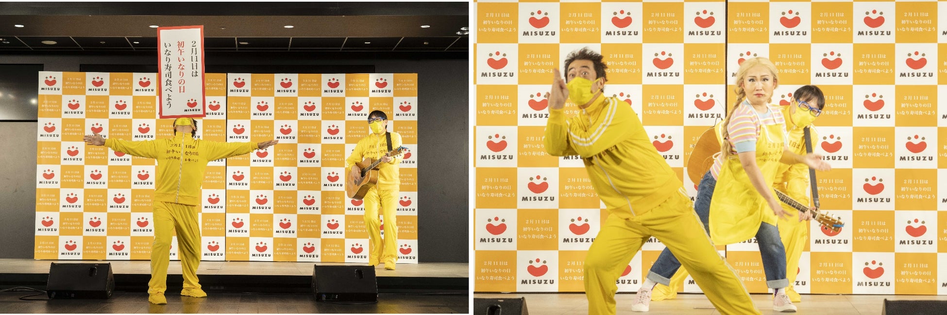 その後、この日のために作ったオリジナルソング「なんでだろう~初午いなりの日ver.~」を披露いただきました。「2月11日に、いなり寿司を食べるのなんでだろう」 「全国には様々な種類のいなり寿司があるけど、テツの顔が“棒いなり”に見えるのなんでだろう」など、初午いなりの日やいなり寿司にまつわる“なんでだろう”を連発し、イベントを盛り上げていただきました。