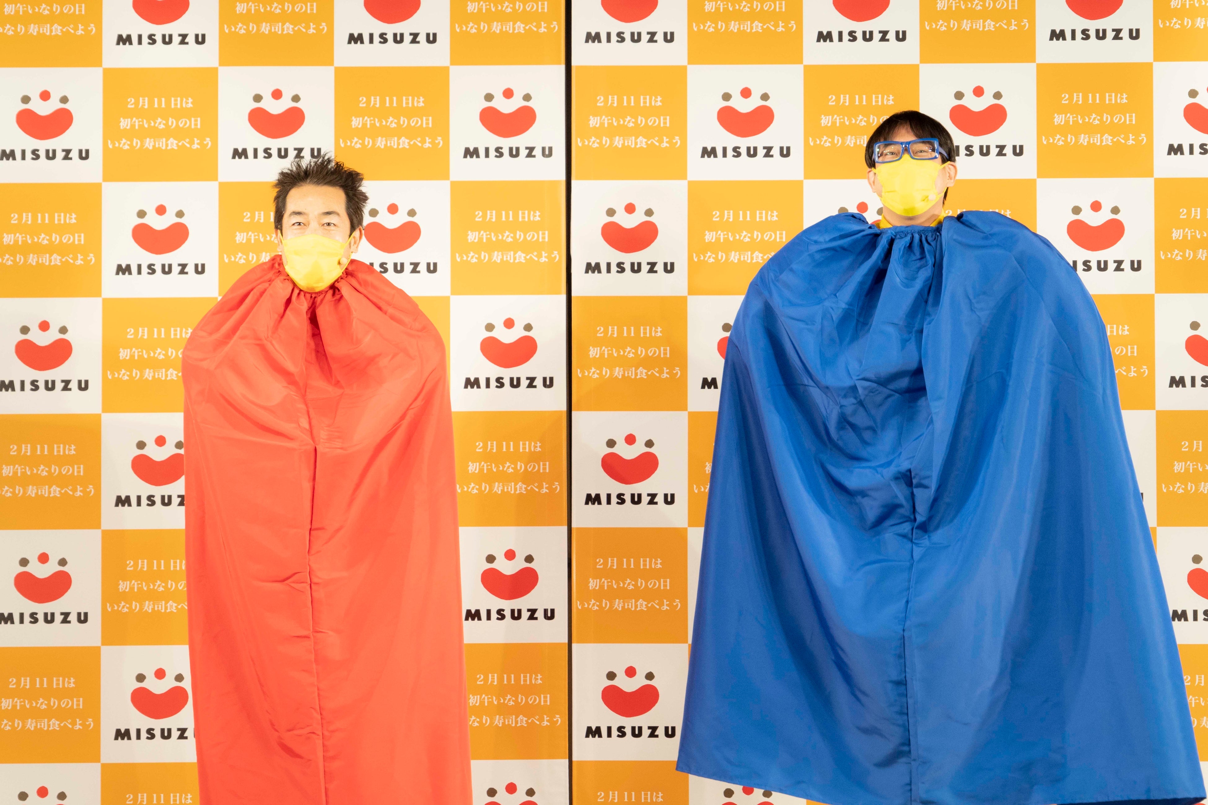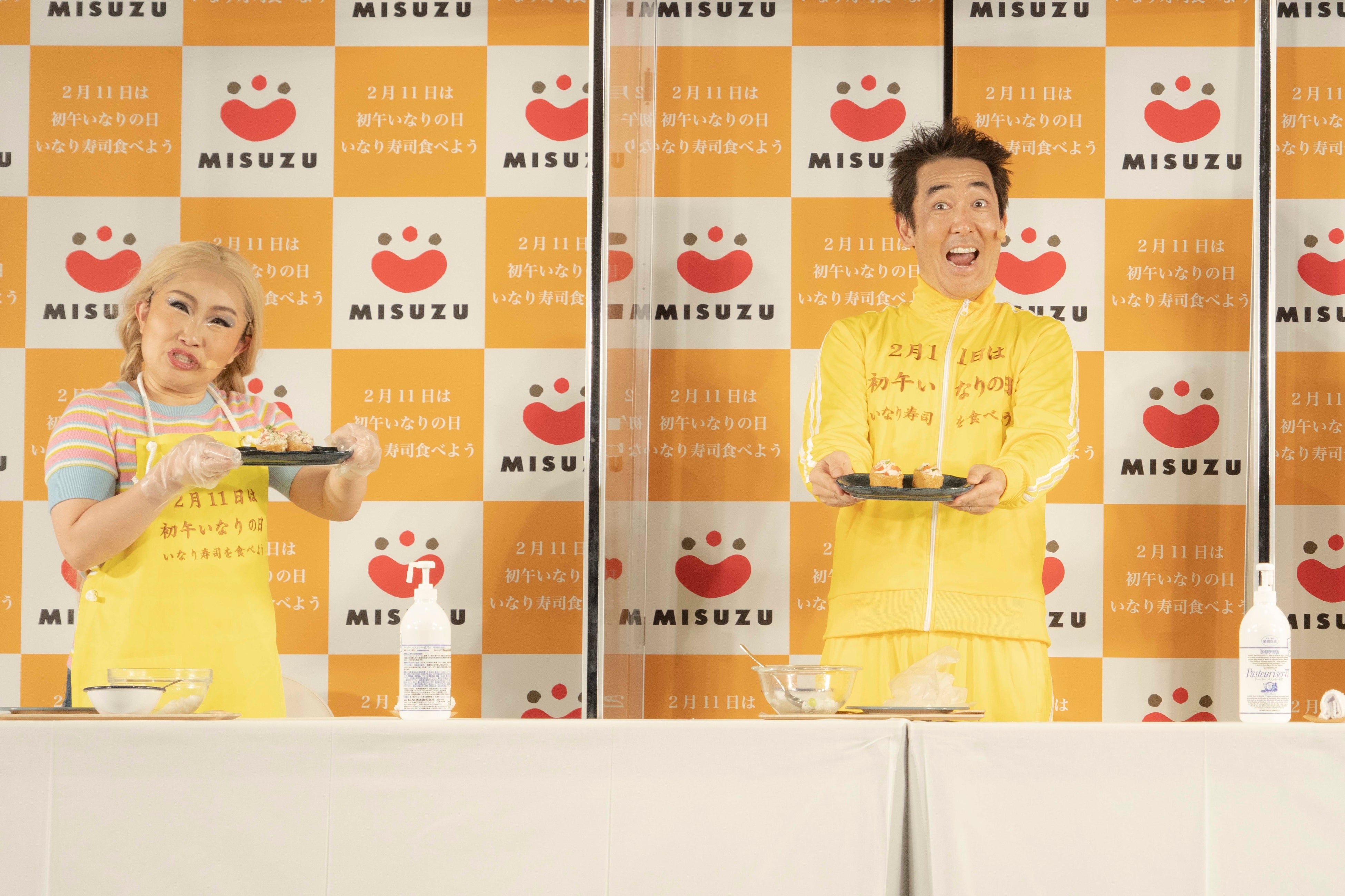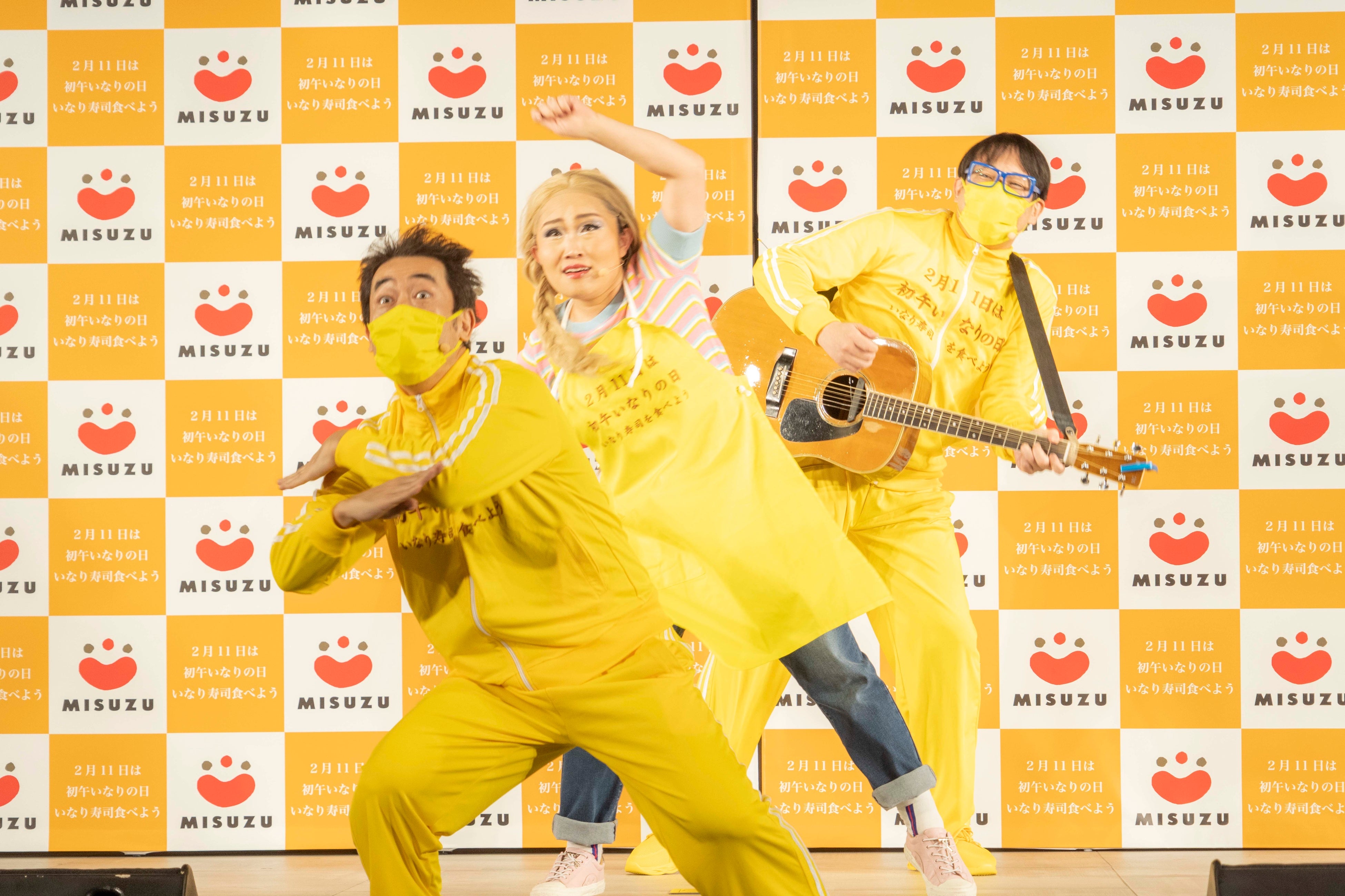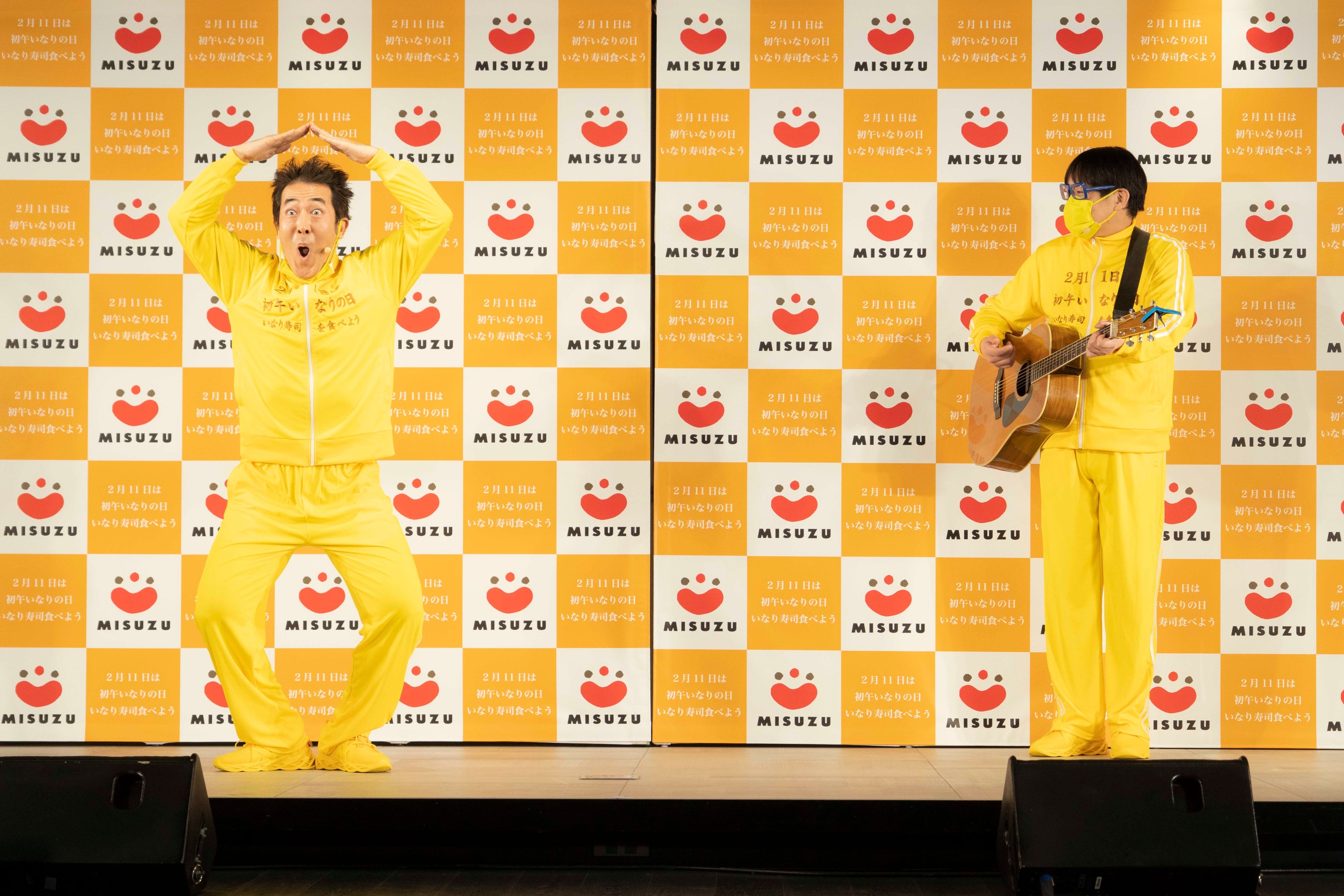 その後、この日のために作ったオリジナルソング「なんでだろう~初午いなりの日ver.~」を披露いただきました。「2月11日に、いなり寿司を食べるのなんでだろう」 「全国には様々な種類のいなり寿司があるけど、テツの顔が“棒いなり”に見えるのなんでだろう」など、初午いなりの日やいなり寿司にまつわる“なんでだろう”を連発し、イベントを盛り上げていただきました。