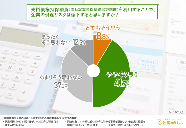 そこで、「売掛債権担保融資(流動試算担保融資保証制度)を利用することで、企業の倒産リスクは低下すると思いますか?」と質問したところ、半数の方が『とてもそう思う(8.8%)』『ややそう思う(41.7%)』と回答し、売掛債権担保融資の利用によって倒産リスクが低下すると見ていることが分かりました。