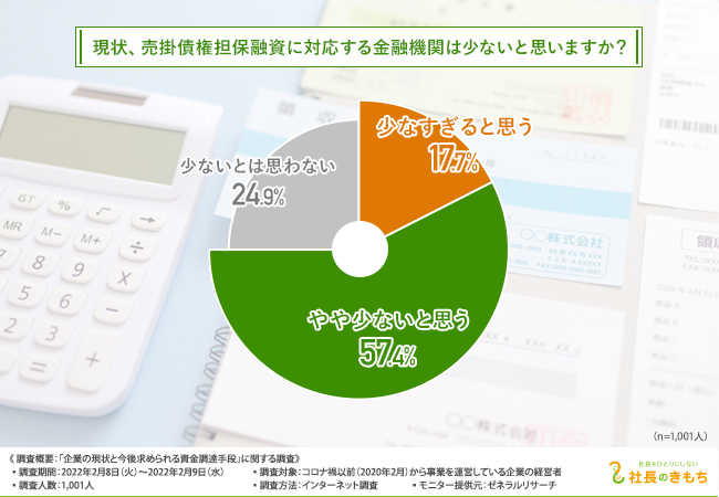 そこで、「現状、売掛債権担保融資に対応する金融機関は少ないと思いますか?」と質問したところ、『少なすぎると思う(17.7%)』『やや少ないと思う(57.4%)』『少ないとは思わない(24.9%)』という結果となり、7割以上の方が、売掛債権担保融資に対応する金融機関は少ないのが現状と見ていることが分かりました。