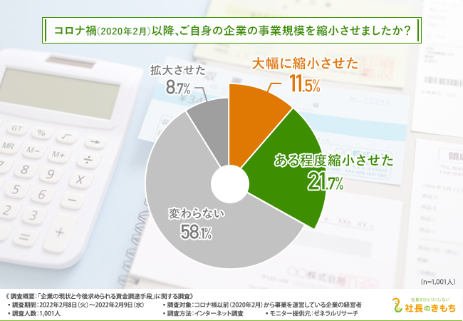 「コロナ禍(2020年2月)以降、ご自身の企業の事業規模を縮小させましたか?」と質問したところ、『大幅に縮小させた(11.5%)』『ある程度縮小させた(21.7%)』『変わらない(58.1%)』『拡大させた(8.7%)』という結果となりました。