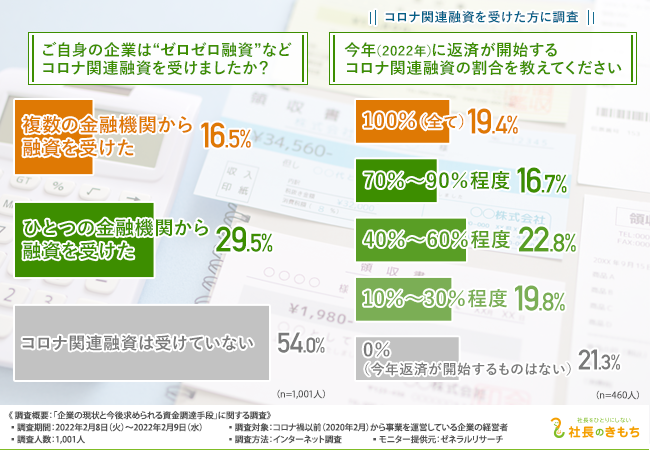そこで、「ご自身の企業は“ゼロゼロ融資”などコロナ関連融資を受けましたか?」と質問したところ、『複数の金融機関から融資を受けた(16.5%)』『ひとつの金融機関から融資を受けた(29.5%)』『コロナ関連融資は受けていない(54.1%)』という結果となり、半数近くの企業が、コロナ関連融資を受けたことが分かりました。