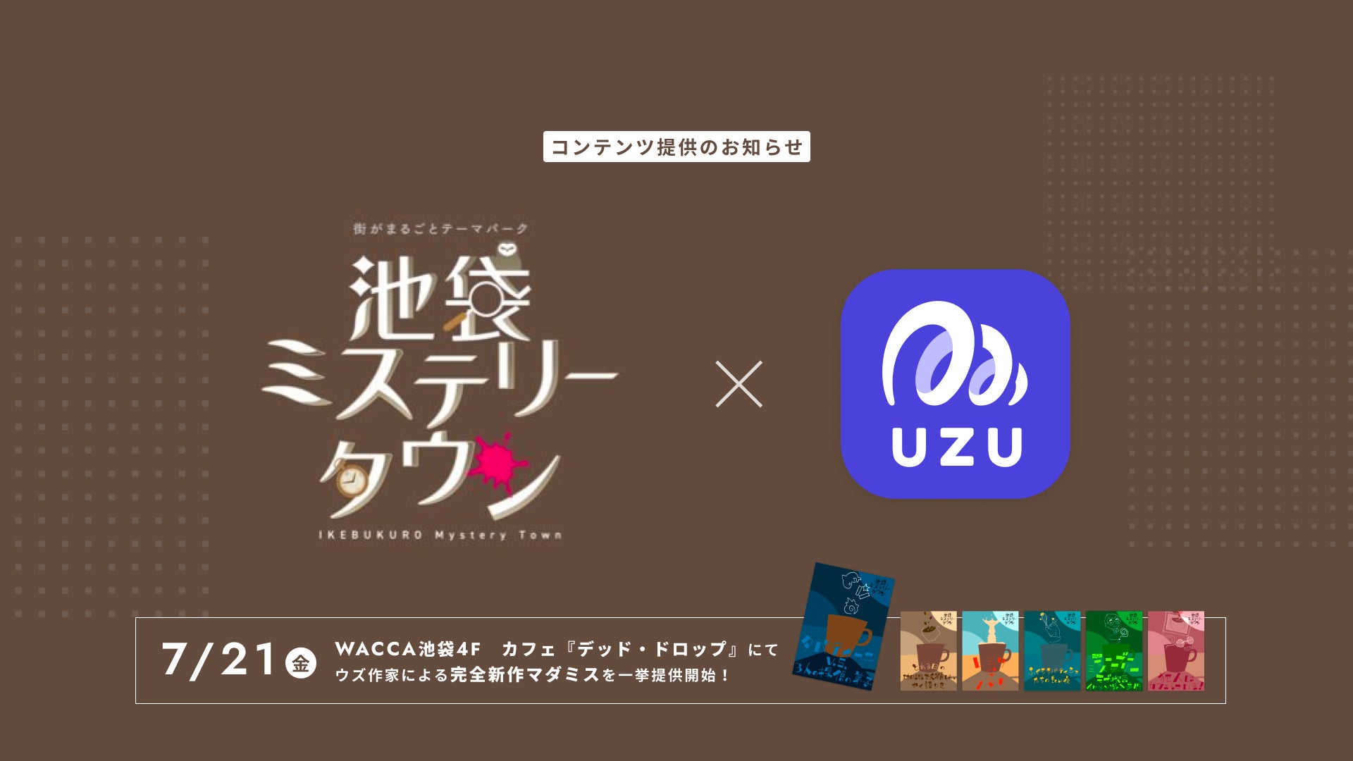 ウズはこれまで、マダミスを気軽に楽しめる環境を作るためにマダミスアプリ「ウズ」を開発してきましたが、この度、池袋ミステリータウンに参加し、ふらっとカフェに入って楽しめる新しい形の気軽なマダミスを提供できることを大変嬉しく思います。