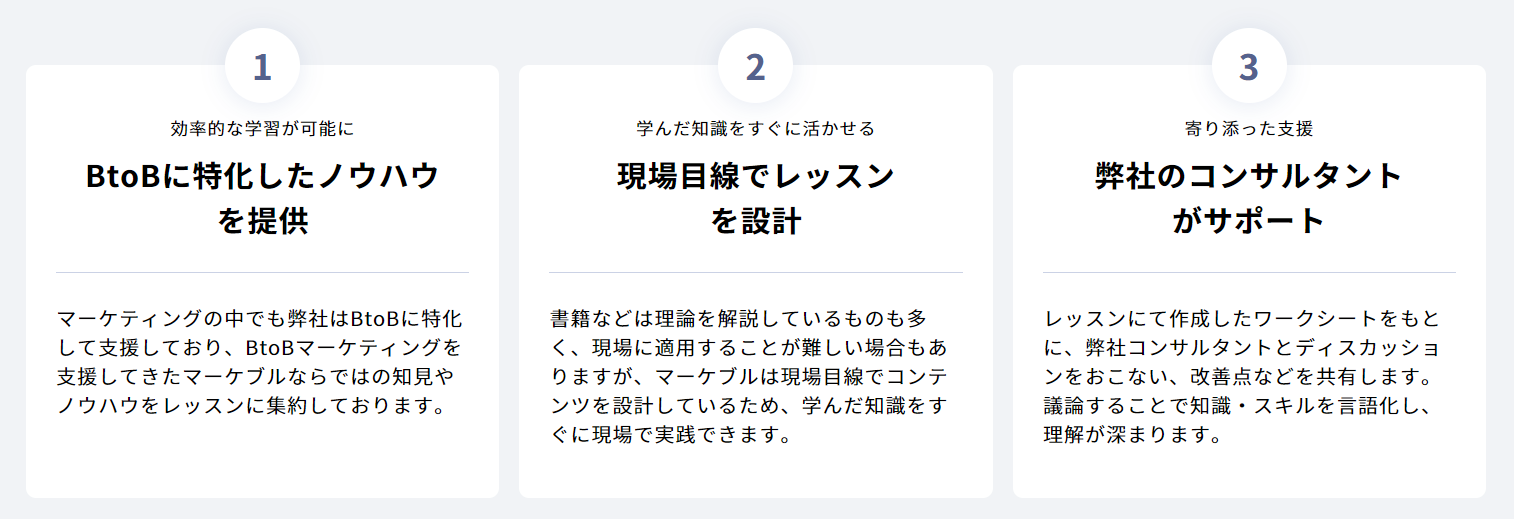 「BtoBマーケティングを担える人材が社内にいない」「マーケティング業務を内製化したいが、何から始めたらいいのかわからない」といった悩みを持つ企業におすすめです。