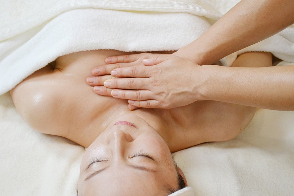 バストやデコルテの肌をサポートする成分配合の美容クリームを使って丁寧にマッサージします