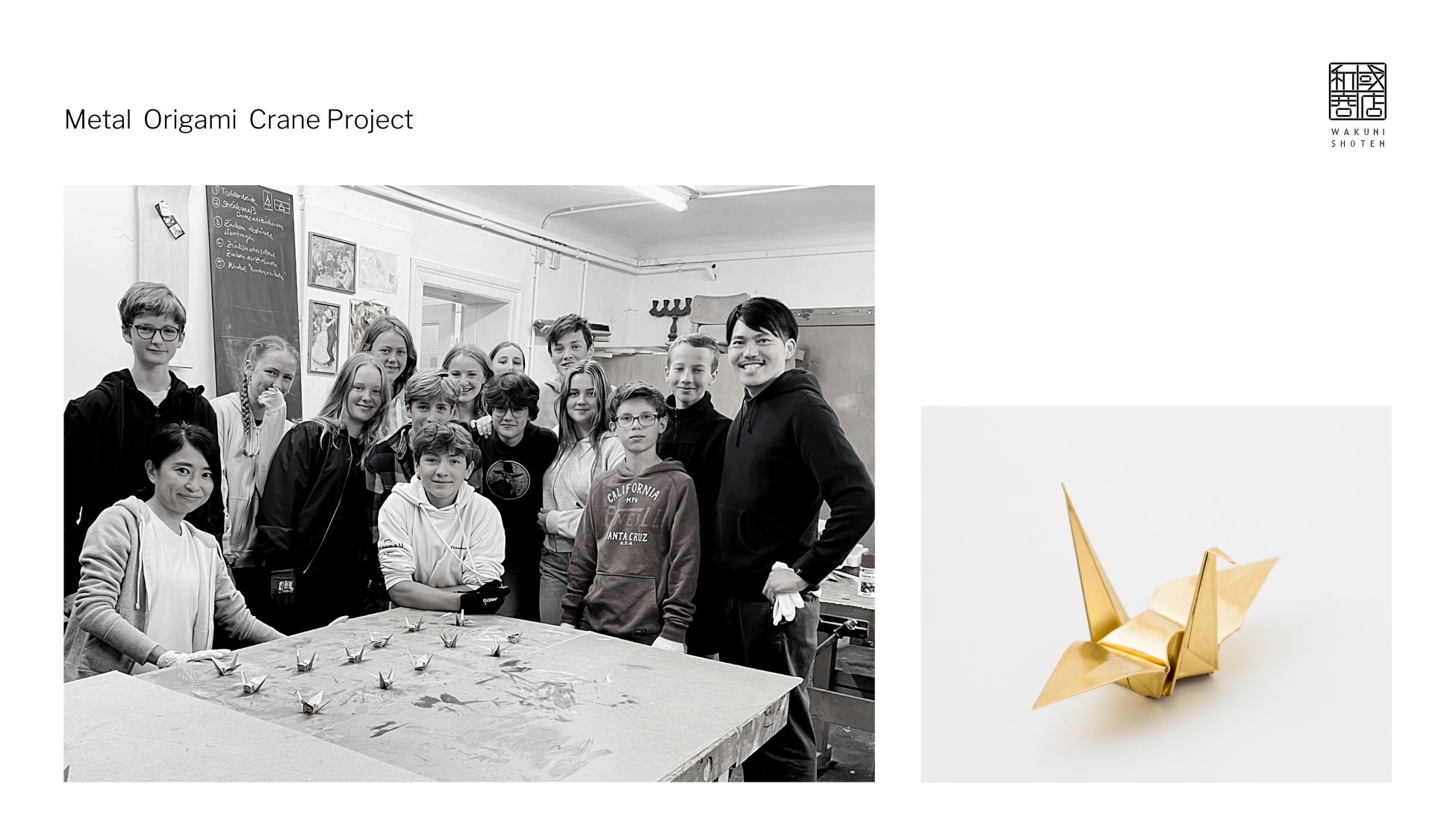 和國商店(わくにしょうてん)は屋根や外壁などの板金を手掛けるウチノ板金の工芸品ブランドで、板金の折鶴は海外のファンも多く、2022年からはフランス・ドイツ・マレーシアの学校・大使館・公的機関・店舗、国内では代官山蔦屋書店で板金折鶴製作のワークショップも開催し、日本文化・板金技術を海外に伝える活動も行っています。