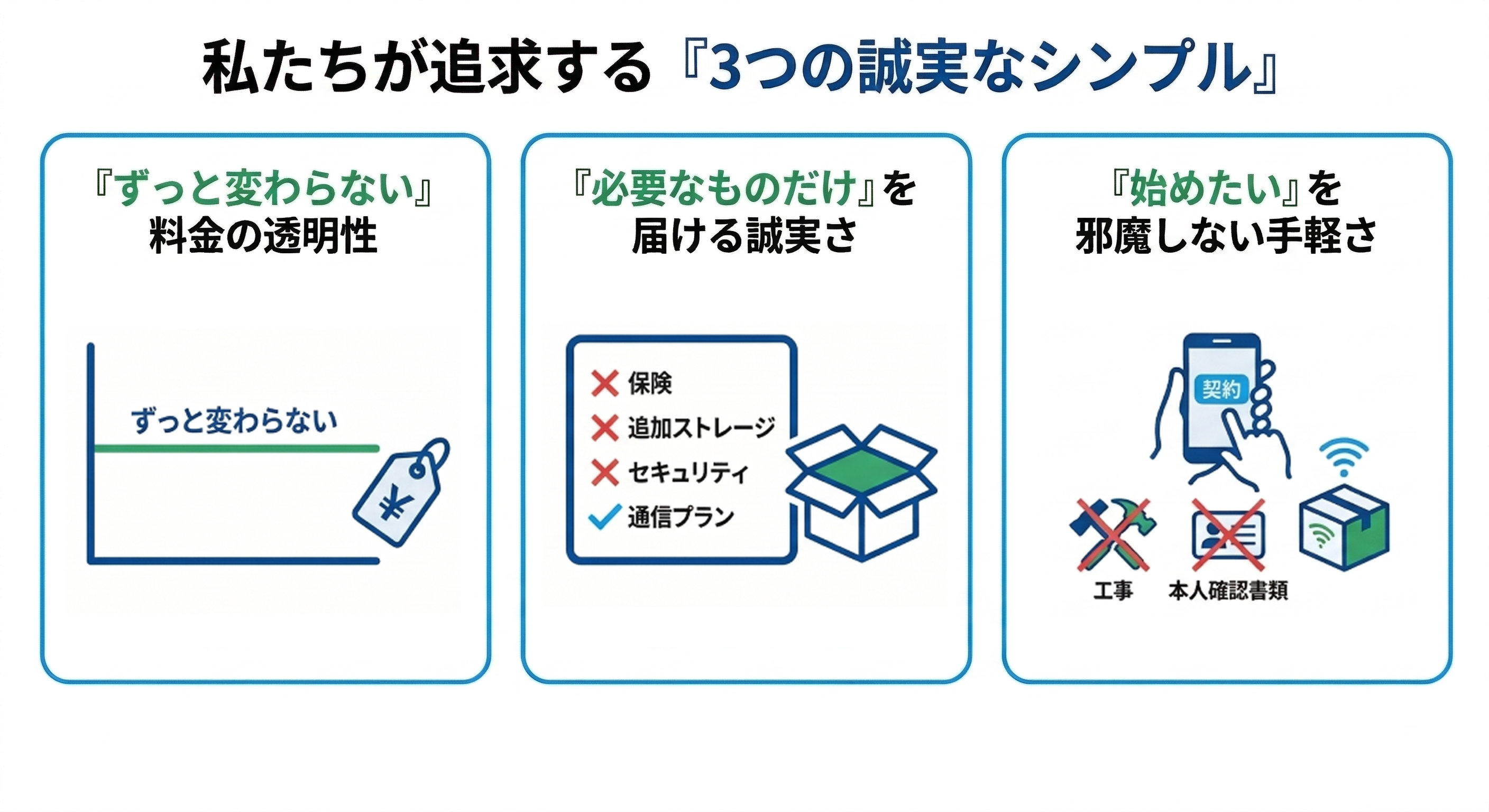 私たちが掲げる夢は、ただWi-Fiをお届けすることではありません。通信に対する「心理的ハードル」をゼロにすることです。そのために、私たちは以下の3つの約束を徹底しています。