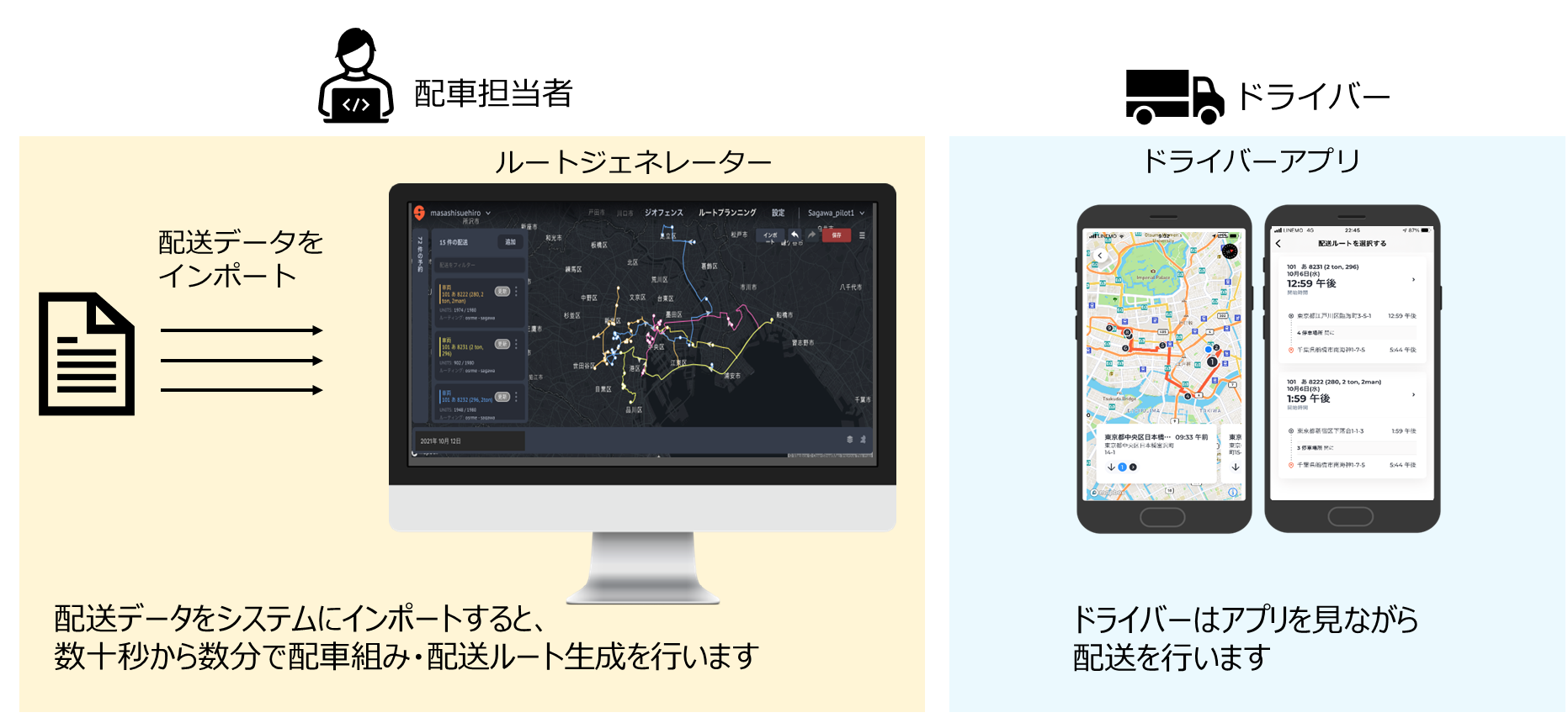 SWAT Mobility Japanは、シンガポールと日本で特許を取得する高精度のルーティング・アルゴリズムを用いて、集配のデータを元に高速かつ正確に車両割り振りと配送ルートの作成が可能なウェブアプリと、作成されたルートに基づいてルート案内を行うタブレット/スマートフォン用アプリを提供します。