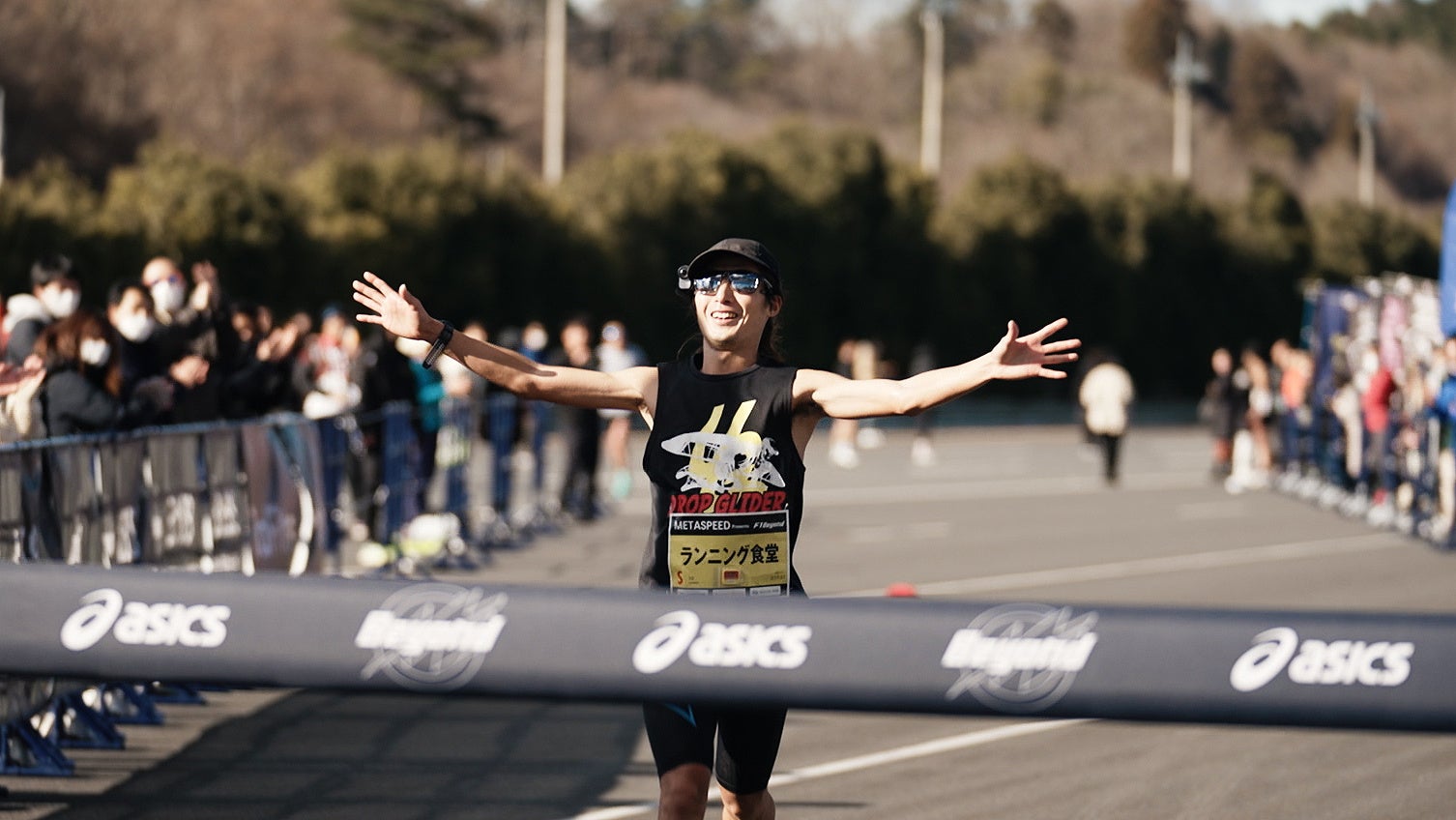 ※昨年のF1 Beyond ・・・昨年は大会当日に優勝候補となる細谷選手やミスターXの欠場が決まり、波乱の幕開けに。序盤は、ぺーサーの新田良太郎選手が3分15秒ペースで引っ張ったこともあり縦長で集団を形成。ペーサーが抜けると、ウルトラマラソン世界一の経験を持つ岡山選手ら実力者を中心に、先頭が目紛しく変わるという展開になりました。25km以降はランニング食堂選手が集団を飛び出すと、そのまま先頭をキープ。2021年大会優勝者のくれいじーかろ選手の追い上げもありましたが一歩及ばず。2時間19分21秒というタイムでランニング食堂選手が初優勝を飾りました。