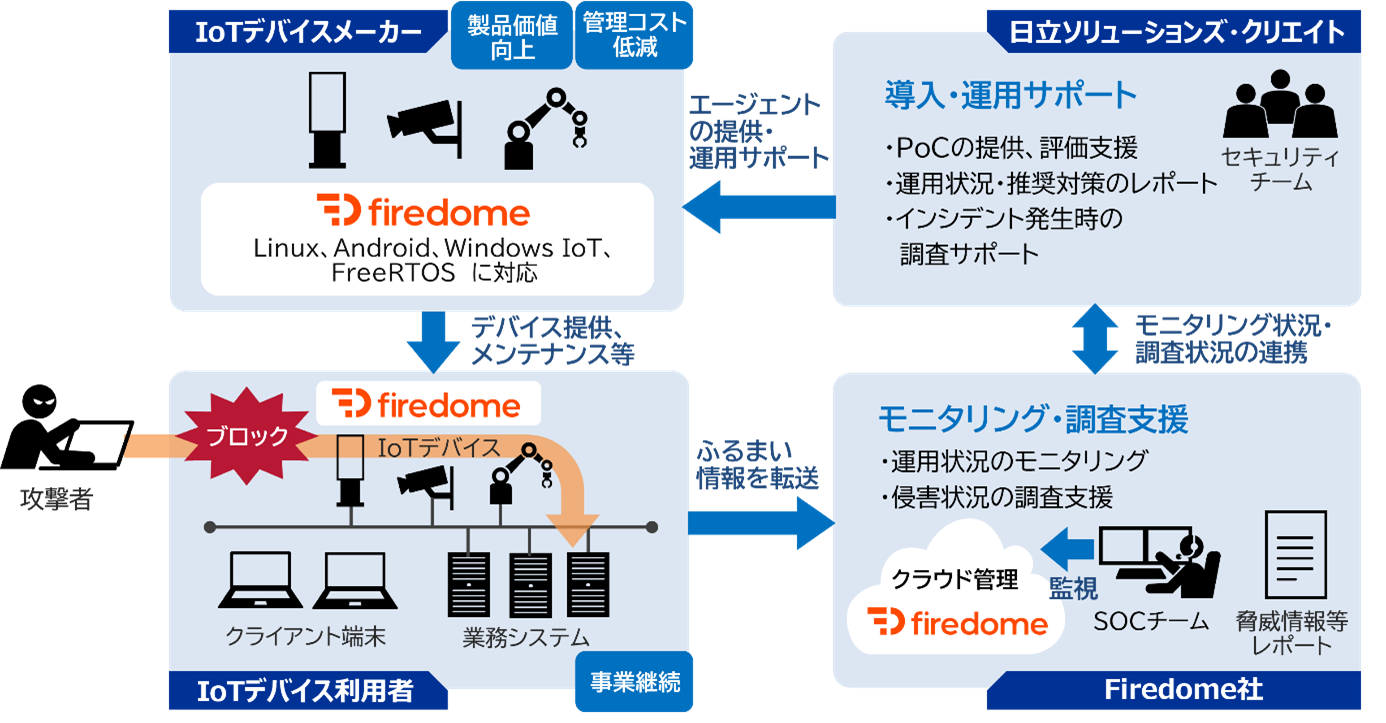 「IoTデバイス向けセキュリティソリューション」は、IoTデバイスのセキュリティ対策について高度な技術と知識を有するFiredome社のセキュリティ製品「Firedome」を、IoTデバイスメーカーが製造するデバイスに合わせてカスタマイズして提供します。導入後は、日立ソリューションズ・クリエイトがIoTデバイスの状態を継続的に監視してレポートするなど、運用をサポートするため、IoTデバイスメーカーは運用負担を少なくセキュリティの強化を図ることが可能です。