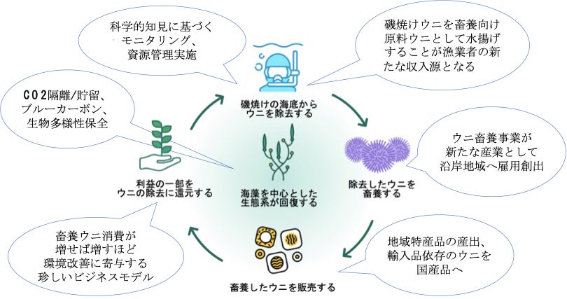 ウニノミクスは国内外の複数拠点で増えすぎたウニを採集し、天然由来の飼料を与えて食用に適したウニへと畜養を行います。畜養されたウニは食用として販売され、販売利益はさらなる事業拡大を通じてウニの除去や藻場の回復に還元されます。