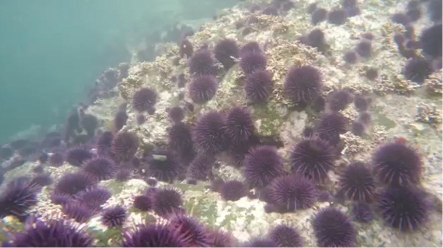 海洋の浅瀬に海藻が群生する藻場は、小魚をはじめとした海洋生物の隠れ場所や産卵場所などの生活の場になっていると同時に、光合成を通して大気中のCO2を吸収・貯留する「ブルーカーボン」として注目を集めています。一方で増えすぎたウニが海藻を食べつくし、藻場が枯れる「磯焼け」が近年大きな問題となっています。増殖したウニは飢餓状態にあり身が詰まっておらず、食用に適していないため採取も行われていません。