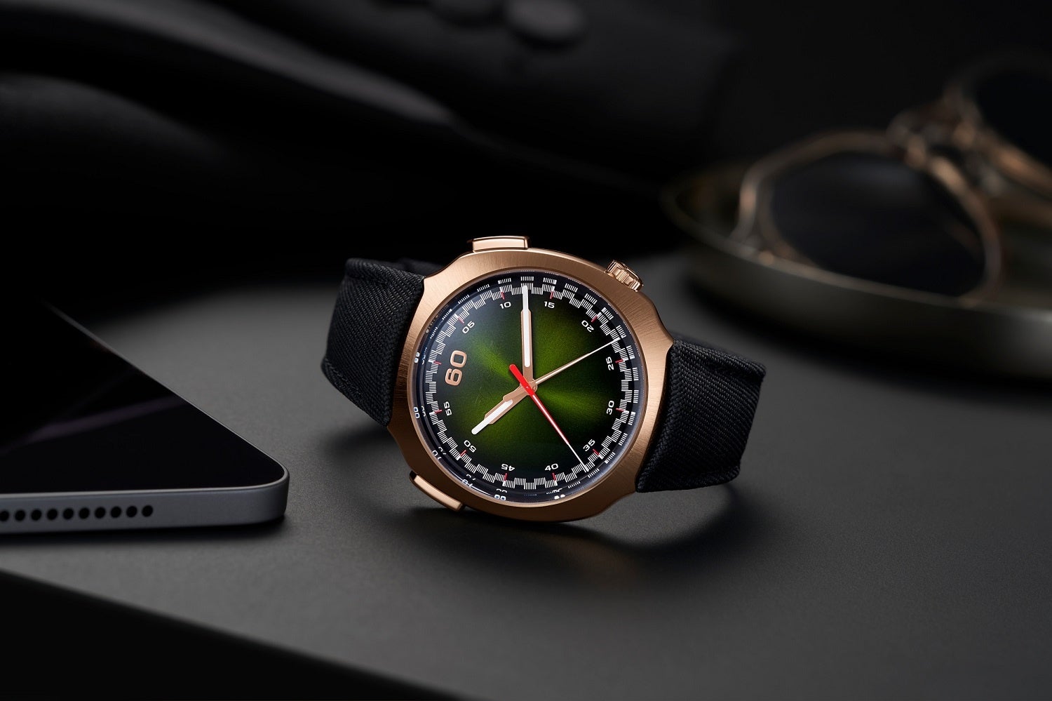 アジェノー社と共同開発自した自動巻きクロノグラフ、マトリクスグリーン フュメダイアル、ケース径42.3㎜、厚さ14.2㎜、5Nレッドゴールドケース、12気圧防水、ケースと一体型のブラックラバーストラップ、