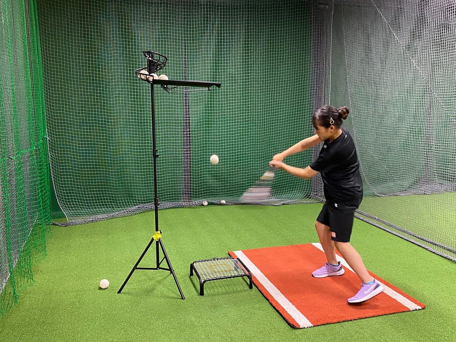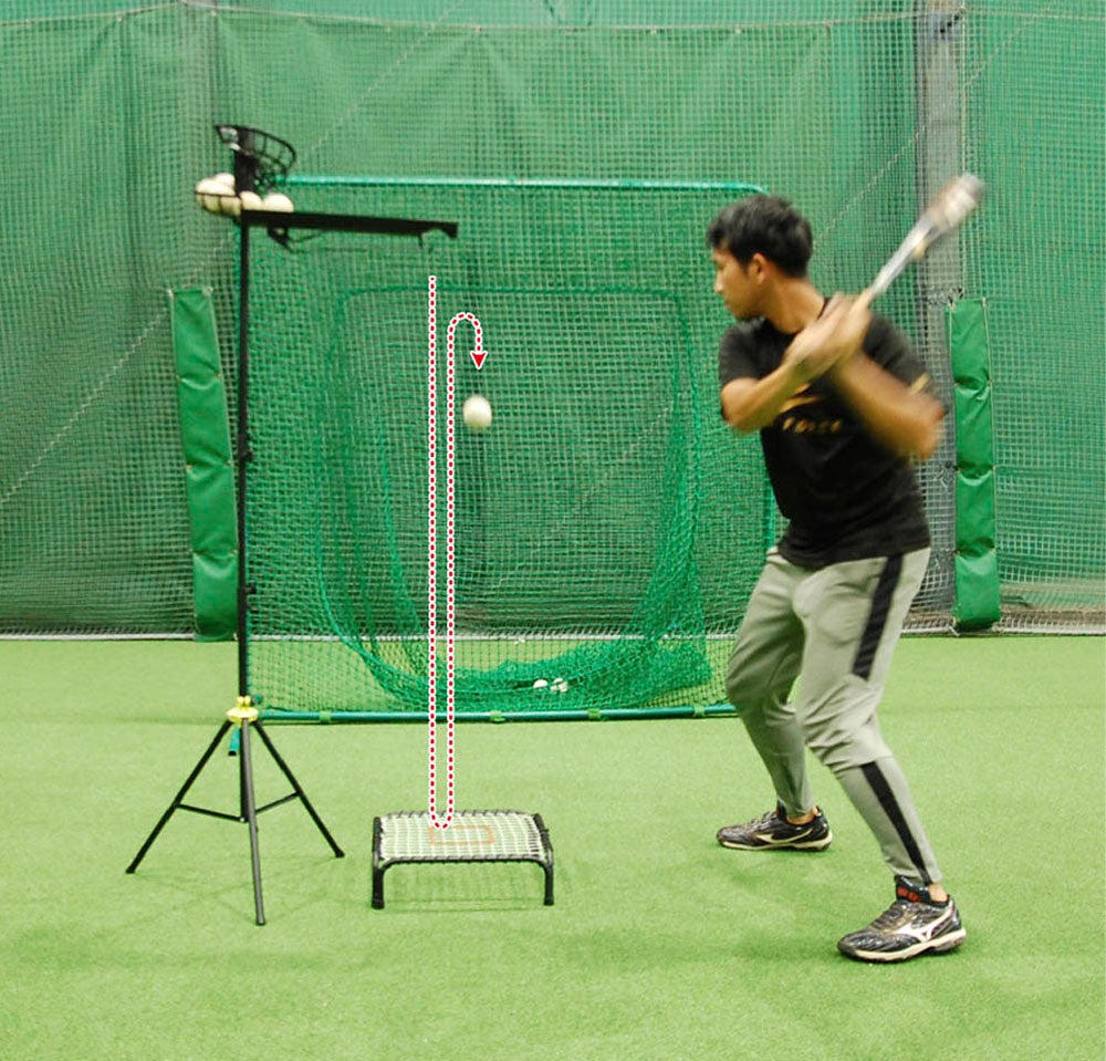 落下ティーはボールが真上から落ちてくるため、バットを振る際の前後移動が制限されます。これを利用することで理想の軸回転でティーバッティングが実現できるようになりました。理想の軸回転を身につけることで、緩いボールなどに対してボールを迎えにいき体勢が崩されてしまうことを減少させます。