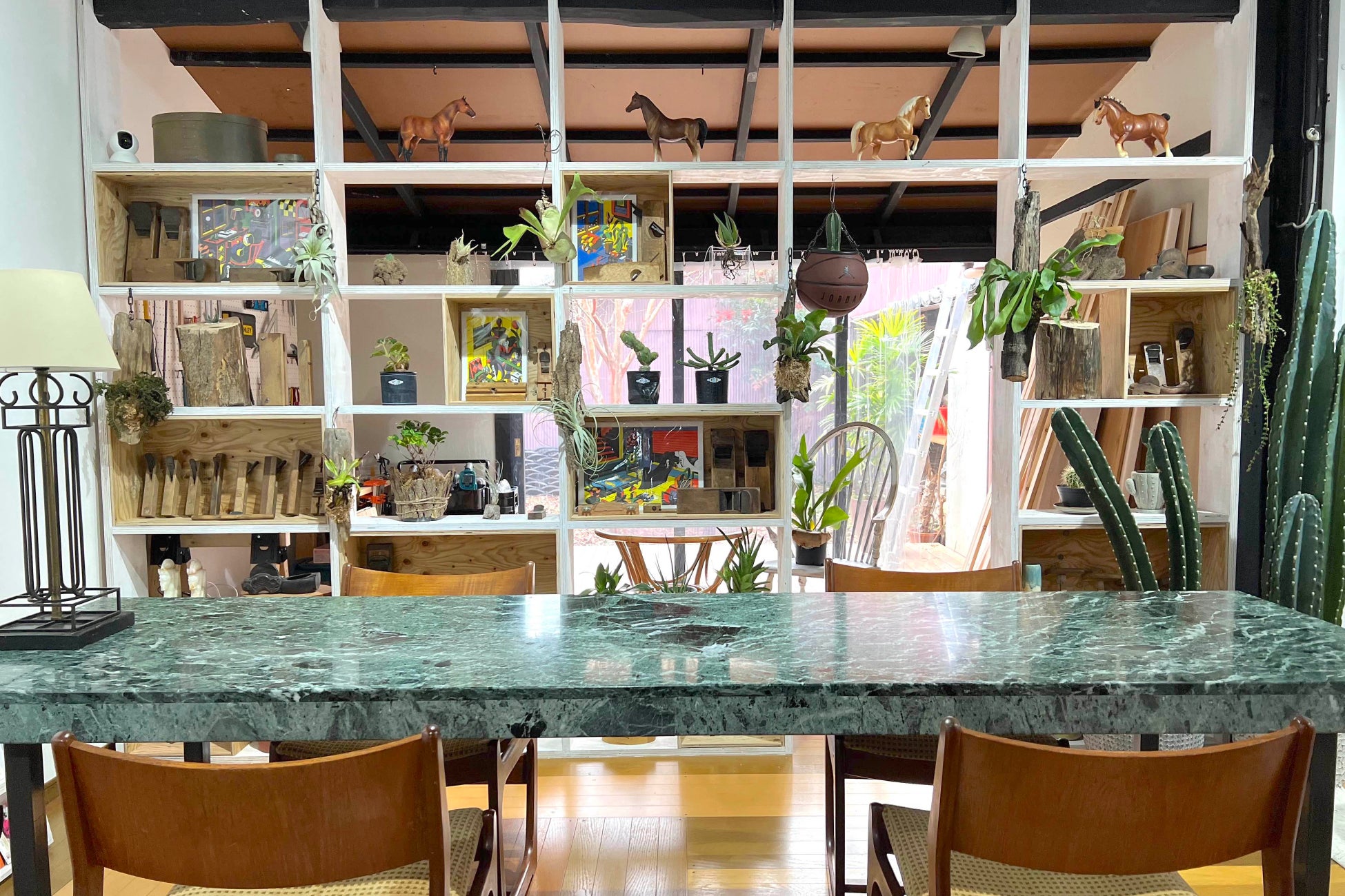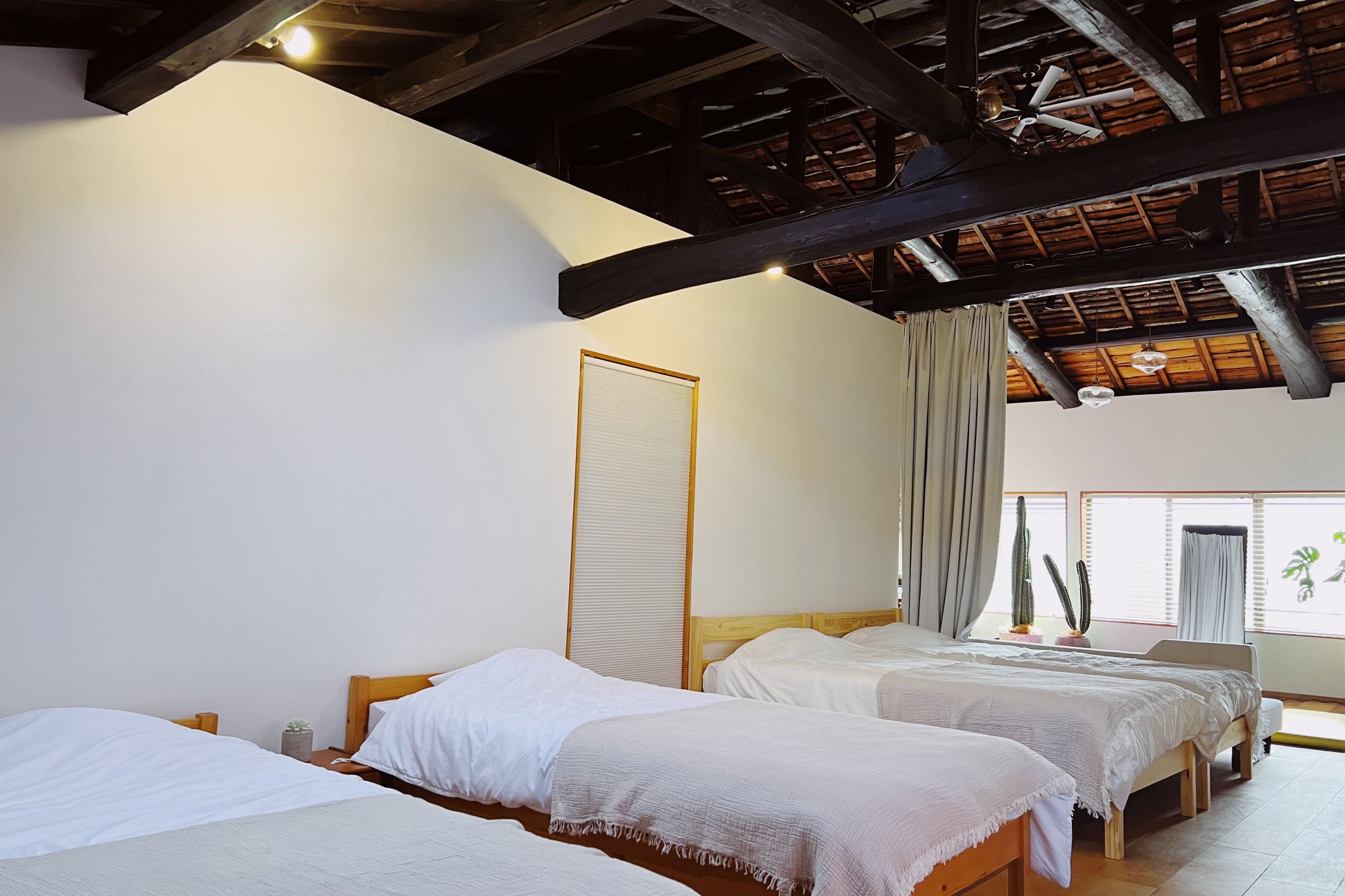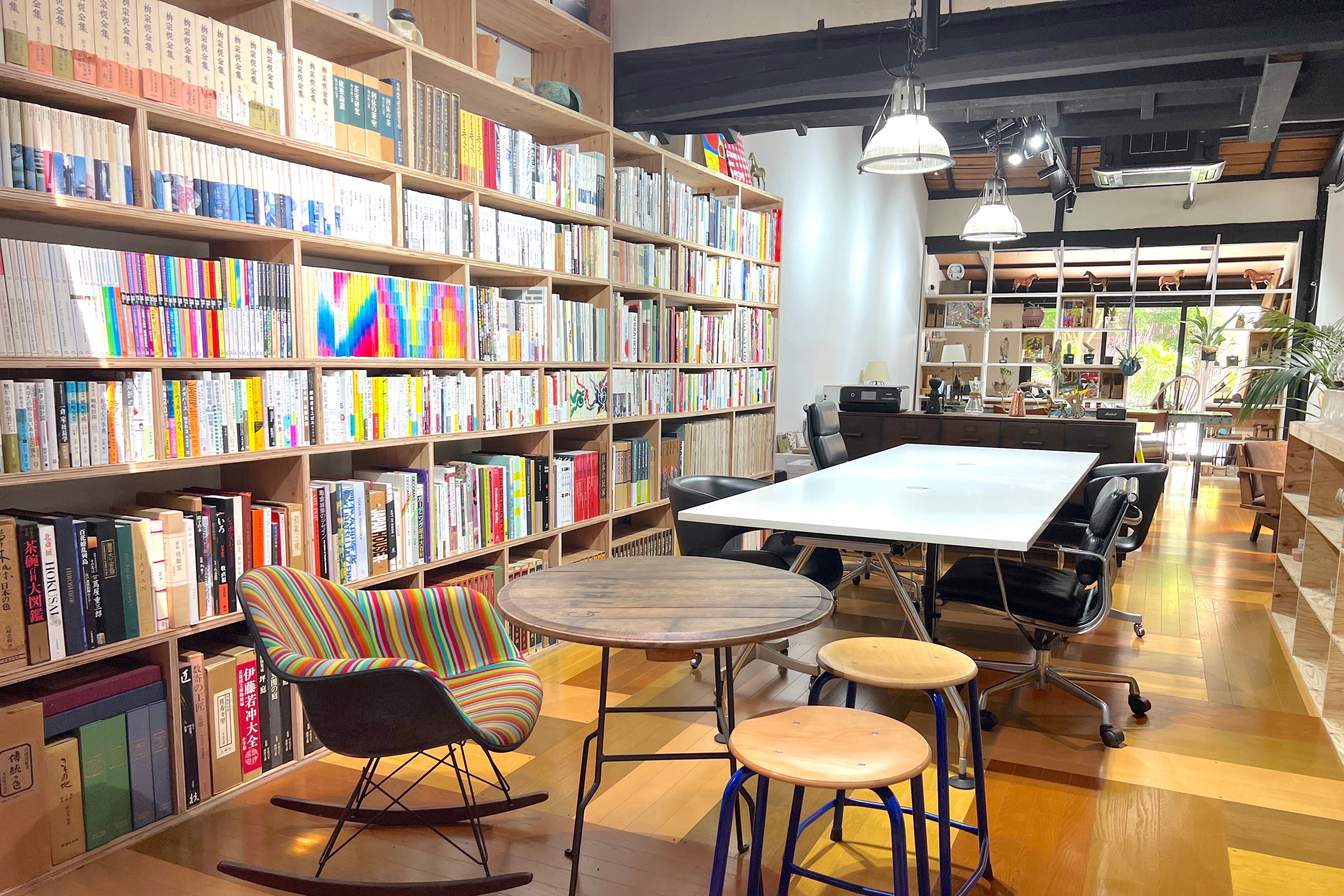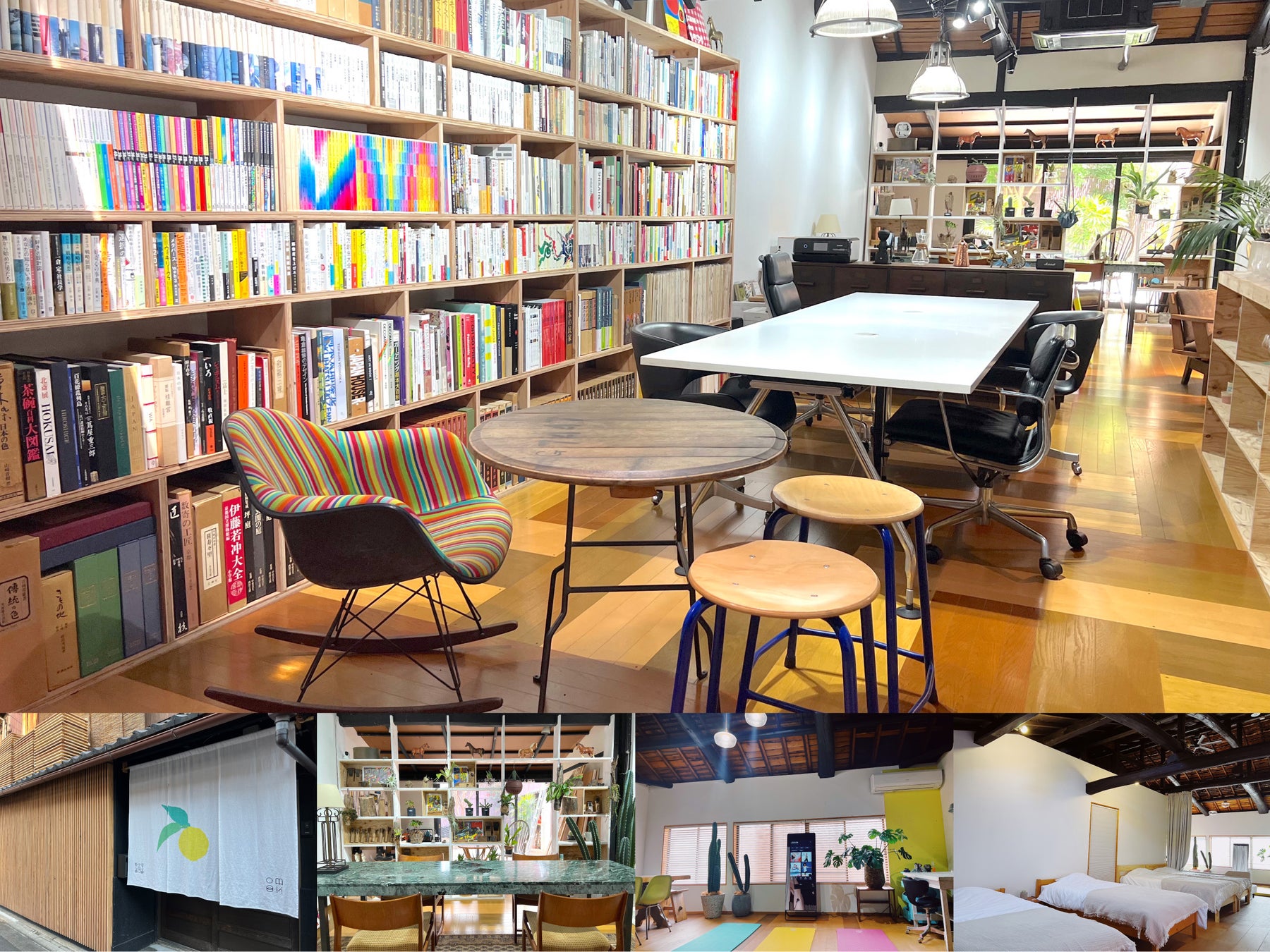 建物は築120年の織物屋の古民家を昔ながらの迫力のある大梁を複数残したままリノベーション。約100平米の1F部のほとんどを占めるゆったりとしたリビングスペースには、空間プロデューサー・佐藤博喜が20年に渡り古書店を歩いて収集した2,000冊以上の書籍(建築、美術、工芸、食、デザイン関連)や300枚のジャズCD、ビンテージ家具が並び、キッチンには日本全国で出会った職人たちによる焼き物セレクション(陶器、磁器、硝子器、竹器)が置かれます。約40平米の2F部はシングルベッド4台が置かれ、奥にはプライベートフィットネス機・MIRROR FIT.を設置。庭に面した約15平米のデッキでは朝晩のゆっくりした時間を過ごすことが可能です。