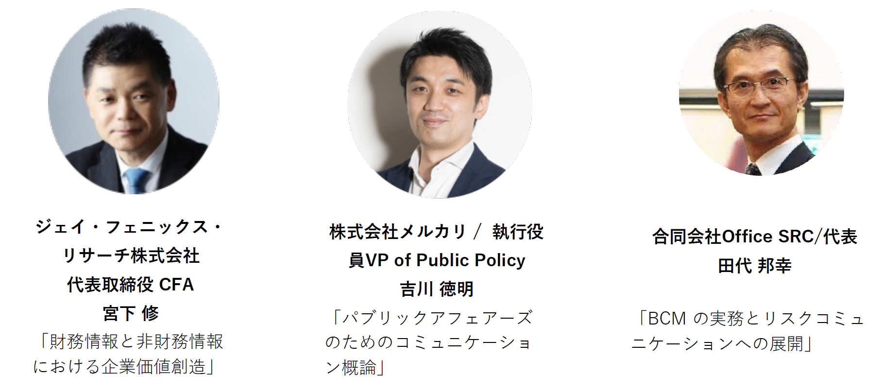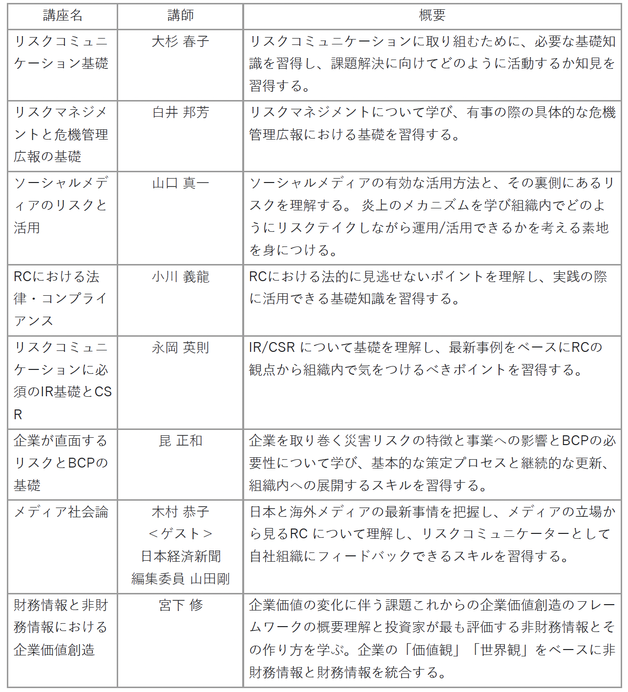 *宮下講師による「財務情報と非財務情報における企業価値創造」については今春開講のRC技能認定第一種でご受講いただけます。吉川講師の「パブリックアフェアーズのためのコミュニケーション概論」及び田代講師の「BCMの実務とリスクコミュニケーションへの展開」は、秋に開講する認定RCアドバイザーの講座での展開を予定しています。