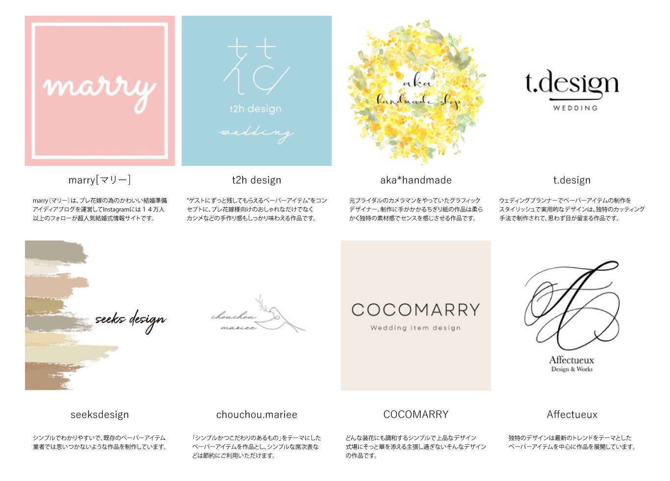 第一回目の認定パート―なの募集を2024年3月行にい、応募多数の中から8名を認定パートナーとして選定しています。プレ花嫁に人気の結婚準備サイトmarry(URL:https://marry-xoxo.com)や元プランナー、ブライダルカメラマンそして卒花デザイナーまで粒ぞろいのクリエイターが参加している。
