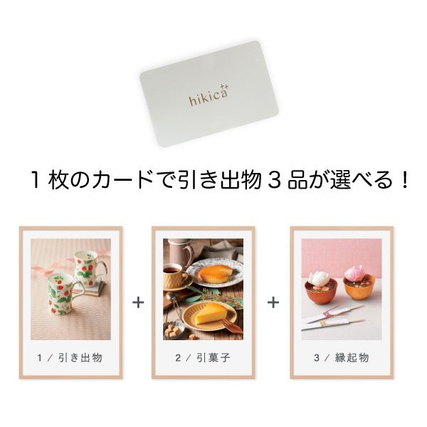 hikica++(ヒキカ)はカード型のカタログ式ギフトで、カードを一枚だけ贈ることで、ゲストは引き出物と引菓子・縁起物の3品を選ぶことができる。選べるコースは8種類で、1万数千点の商品が掲載されており、新郎新婦は価格帯ごとのカードを購入することで簡単に贈り分けすることができる。